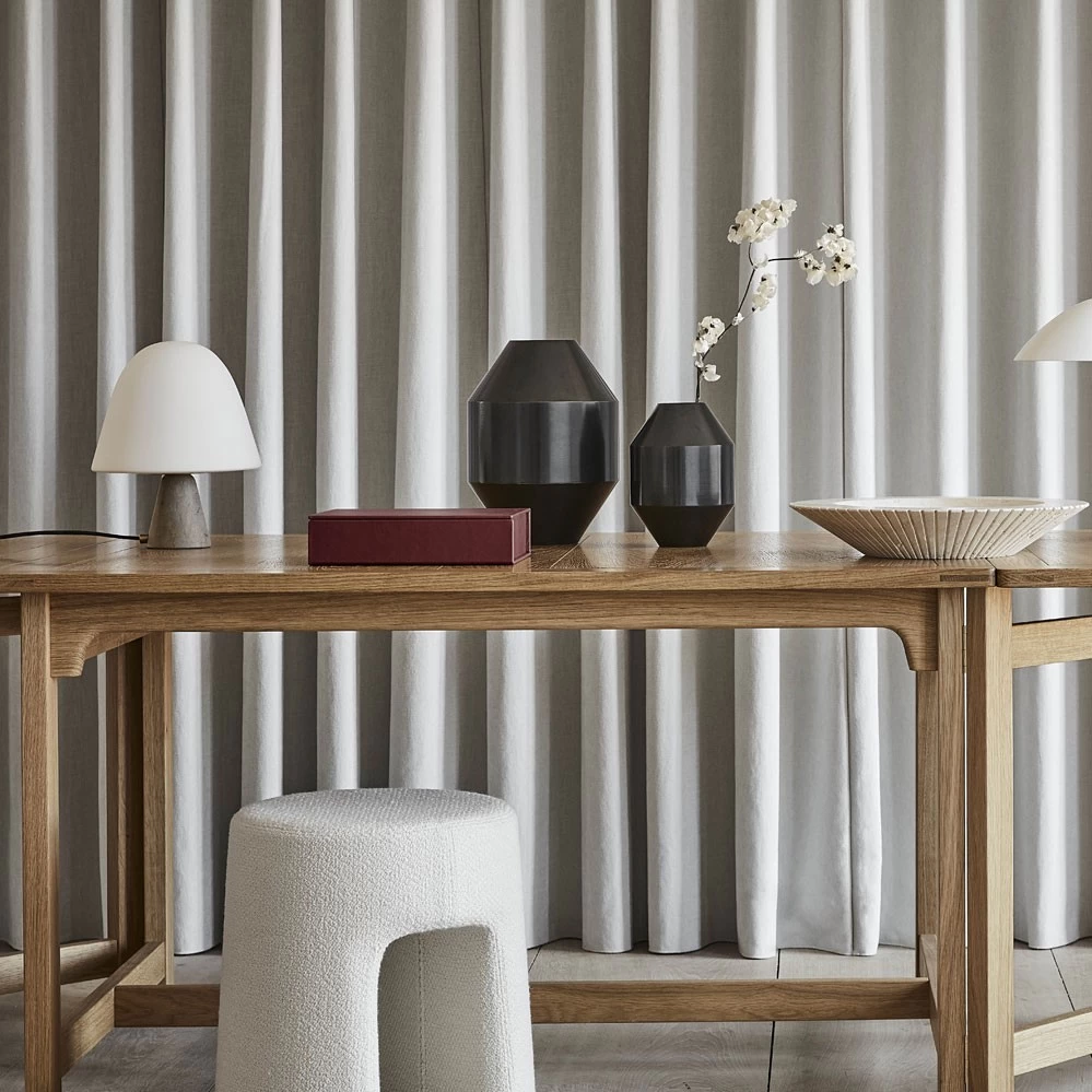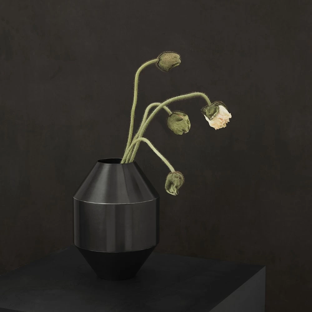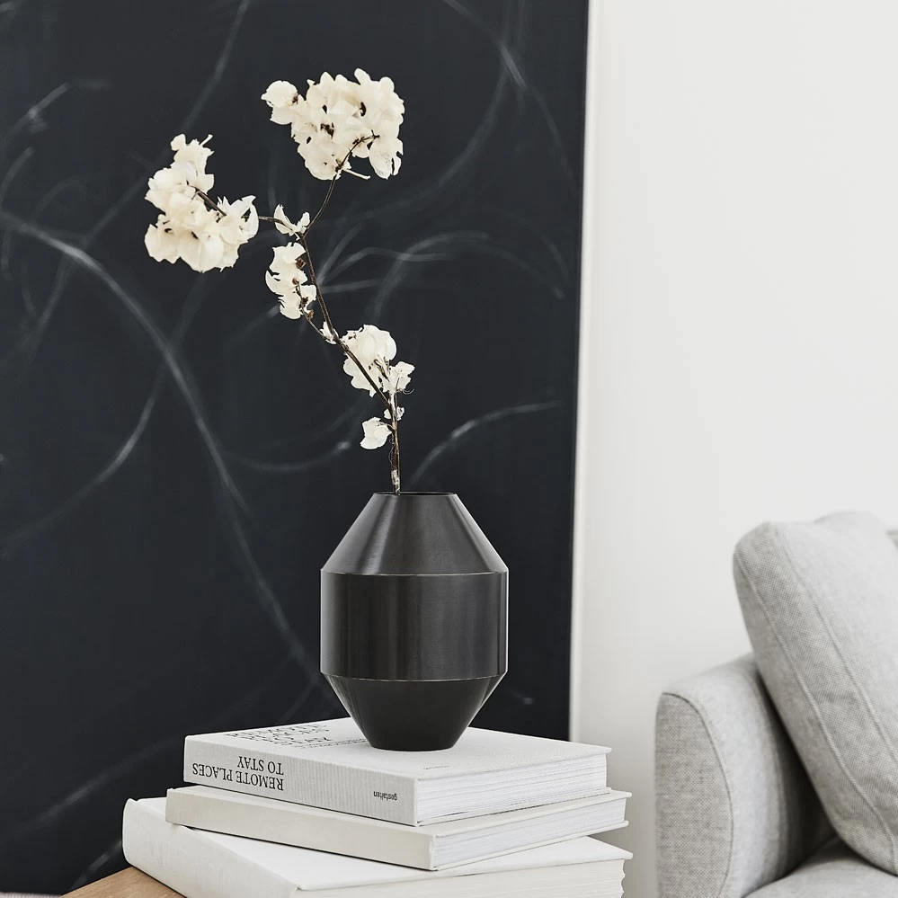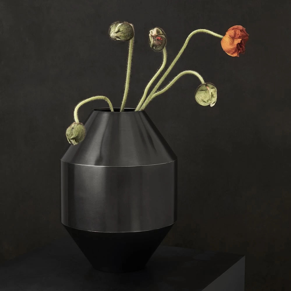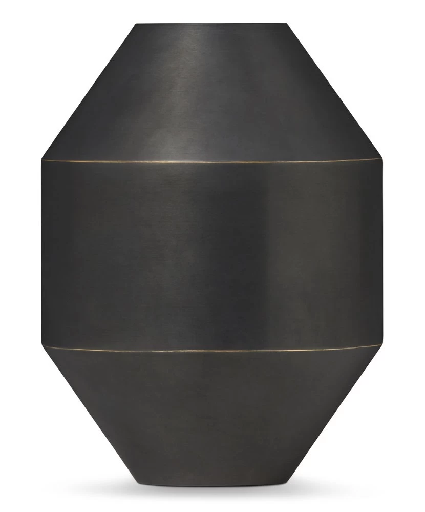 Die Hydro MVase aus schwarz oxidiertem Messing ist ein Design von Sofie Østerby aus dem Jahr 2020 und bei Fredericia in zwei Größen (20 cm und 30 cm) erhältlich.