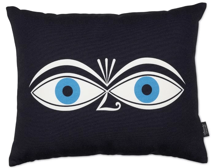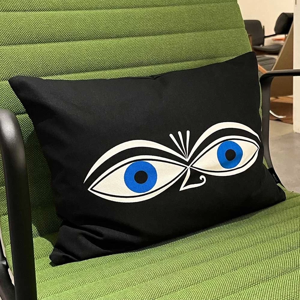 Das Motiv Eyes von Alexander Girard ist eine amerikanische Grafikikone der 1960er Jahre und wurde 2014 von Vitra als Kissen neu editiert. Das Motiv ist dabei zweiseitig.