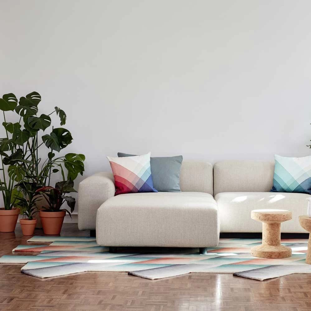 Die Herringbone Pillows des Designduos Raw-Edges vermitteln mit ihren geometrisch wirkenden Mustern Frische und Fröhlichkeit. Die sich überschneidenden und überlagernden Streifen von unterschiedlicher Farbintensität sind durch mehrmaliges Eintauchen in jeweils verschiedene Farben erarbeitet und dann als exakte Vorlage für den Druckprozess der Kissen übernommen worden.