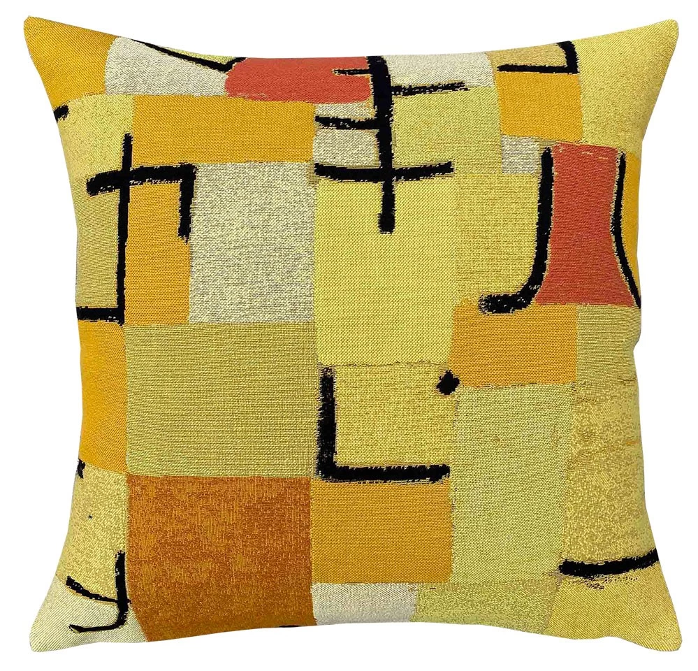 Das Kissen Signs in Yellow basiert auf der Komposition des Künstlers und Bauhausmeisters Paul Klee aus dem Jahr 1937. Das Kissen, hergestellt von der französischen Weberei von Jules Pansu, zeigt dabei ein Ausschnitt des Gemäldes, welches sich im Besitz der Fondation Beyeler befindet. Das Kissen zählt zu der Exclusive Line von Jules Pansu. die in sehr feiner Jaquard-Webtechnik hergestellt wird.