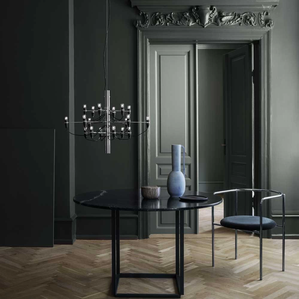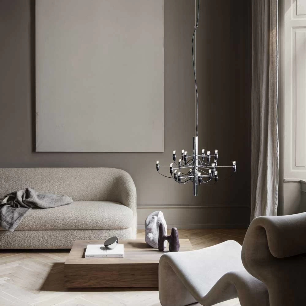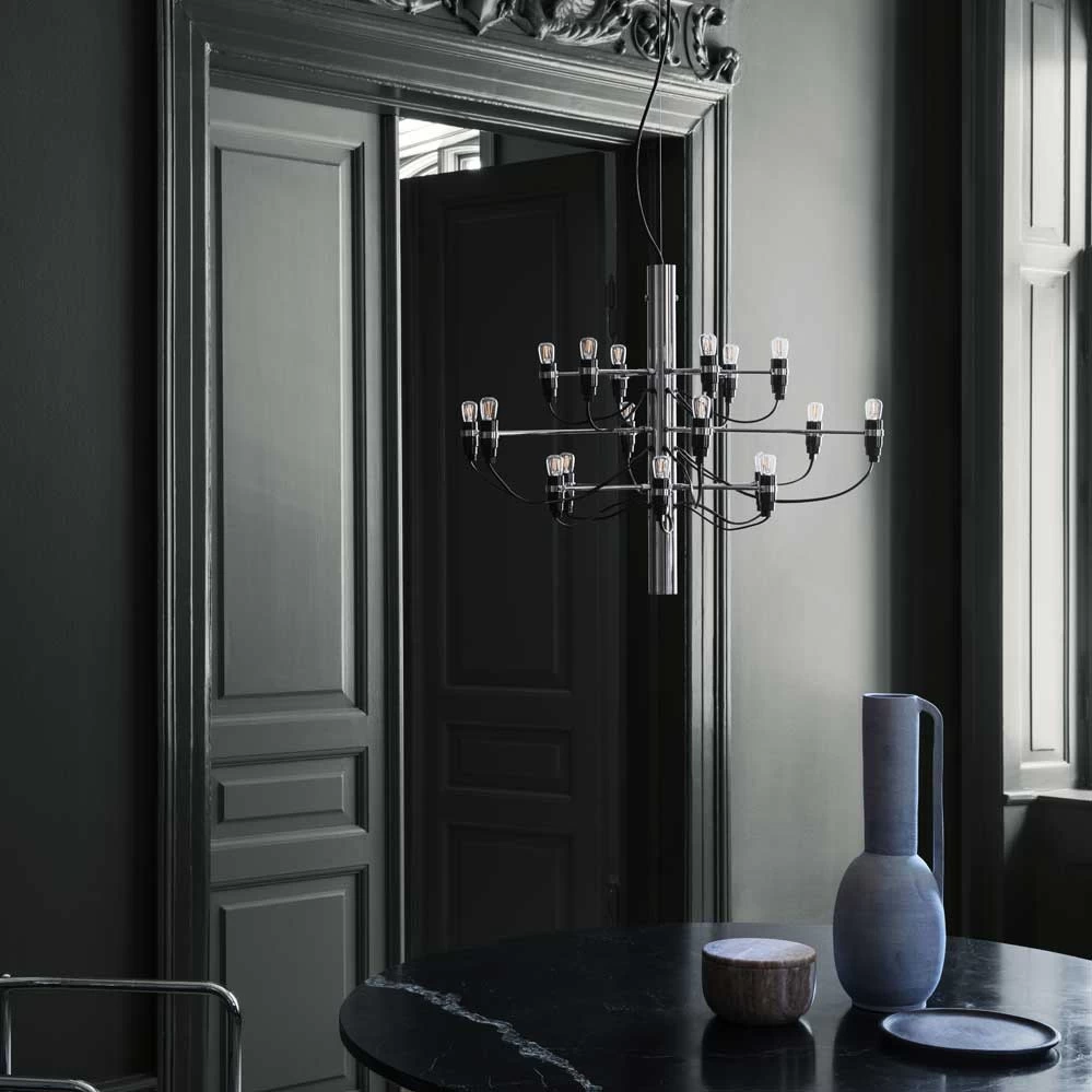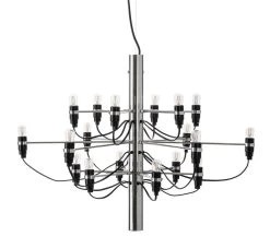Der Kronleuchter 2097 ist die moderne Interpretation eines klassischen Kronleuchters. Dabei verdrängen 18 Glühbirnen die traditionellen Kerzen und eine sichtbare Verkabelung die sonst üblichen Kristallsteine. Der Entwurf von Gino Sarfatti aus dem Jahr 1958 wirkt zeitlos und wurde ohne Unterbrechnung zuerst von Arteluce, später dann von Flos, produziert. Gino Sarfatti war Gründer der berühmten italienischen Leuchtenmanufaktur Arteluce, die später von Flos übernommen wurde. Bereits 1939 startete Arteluce mit Entwürfen moderner italienischer Designer (meistens von Gino Sarfatti selbst) und erwarb sich in den 1950er und 60er Jahren den Ruf als Pionier des Lichtdesigns. Erhältlich ist der Kronleuchter 2097 aktuell bei Flos in drei Größen.