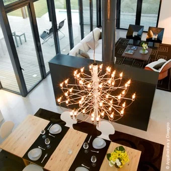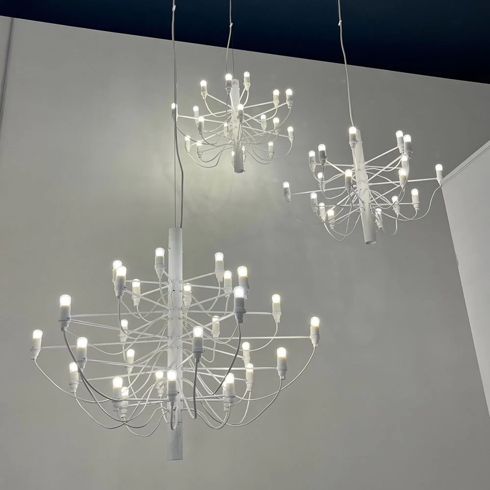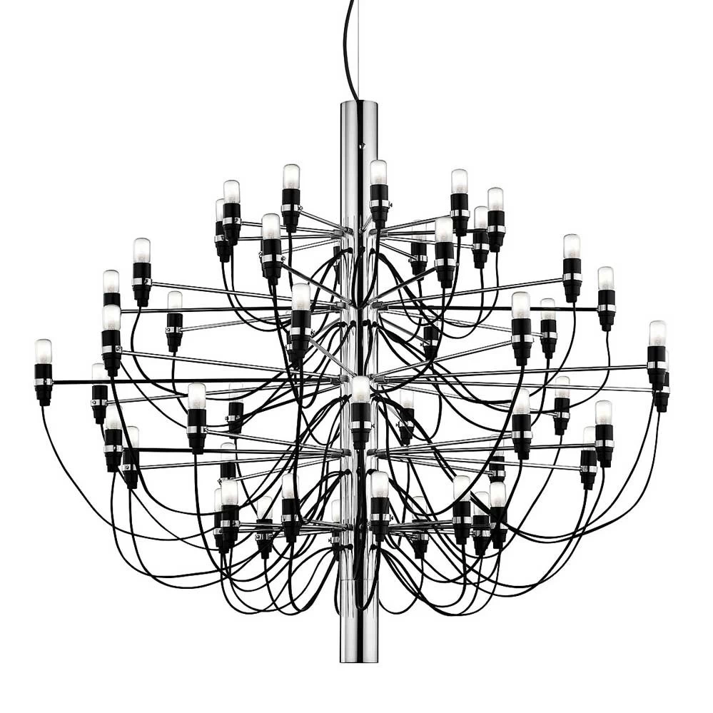 Mit 50 Leuchtstellen ist der Flos Kronleuchter 2097/50 die größte Variante der drei Kronleuchter von Gino Sarfatti. Dabei verdrängen 50 LED-Glühbirnen (im Lieferumfang enthalten) die traditionellen Kerzen und eine sichtbare Verkabelung die sonst üblichen Kristallsteine. Der Entwurf von Gino Sarfatti aus dem Jahr 1958 wirkt zeitlos und wurde ohne Unterbrechnung zuerst von Arteluce, später dann von Flos, produziert.