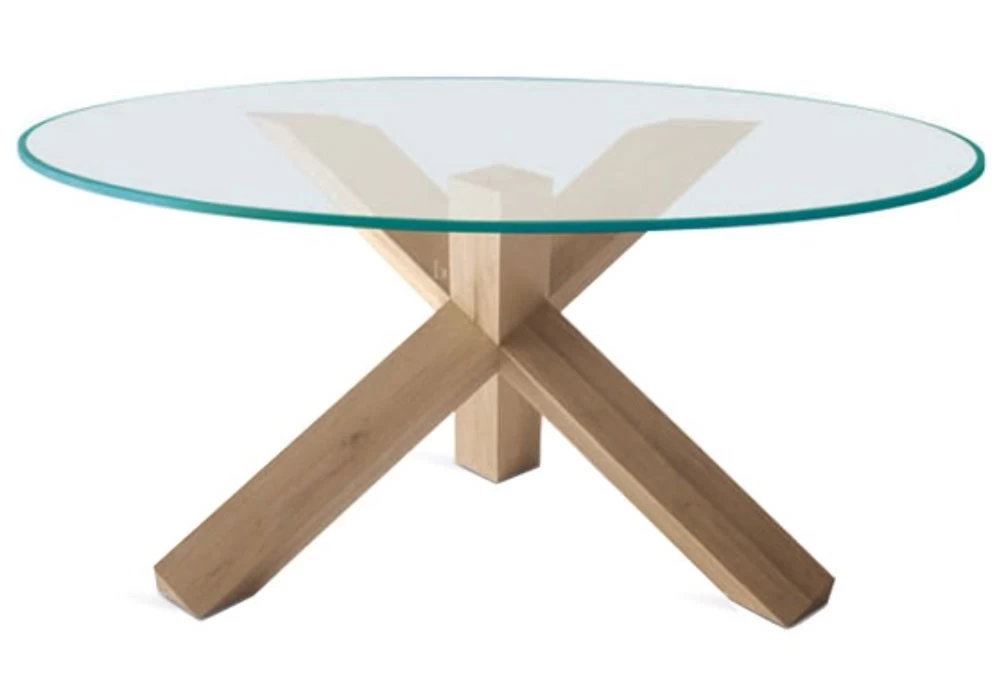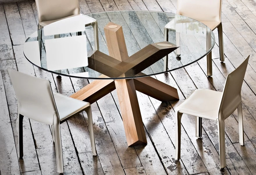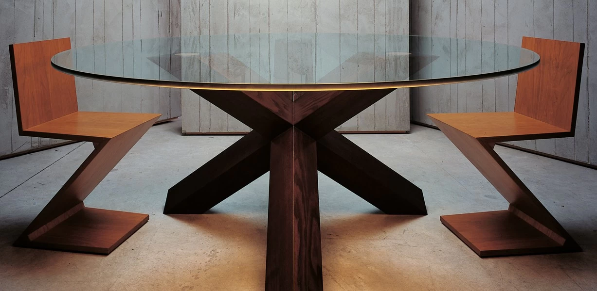 Den Glastisch La Rotonda entwarf Mario Bellini im Jahr 1972 für Cassina. Das Besondere an der Konstruktion ist das skulpturale Holzgestell. Was einfach aussieht, ist in Wirklichkeit das Ergebnis aufwendigster Handarbeit, wovon wir uns selbst bei einem Besuch der Cassina Tischlerei in Meda überzeugen konnten.
