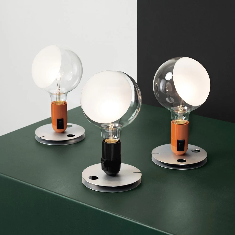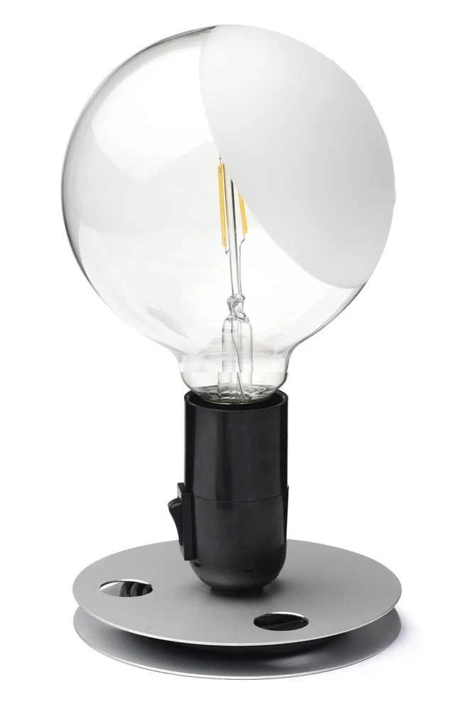 Die kleine Tischleuchte Lampadina ist ein Entwurf Achille Castiglioni aus dem Jahr 1972 zur Eröffnung des damaligen Flos Showrooms in Turin. Der Fuß aus eloxiertem Aluminium ist dabei gleichzeitig Kabelaufwickler. Die Fassung ist aus Bakelit, das großformatige Globe-Leuchtmittel ein Bestandteil des Designs (Lieferung inklusive einer LED Globe-Glühbirne mit 2 Watt). 2020 ergänzte Flos die Lampadina Kollektion um weitere Farbvarianten.