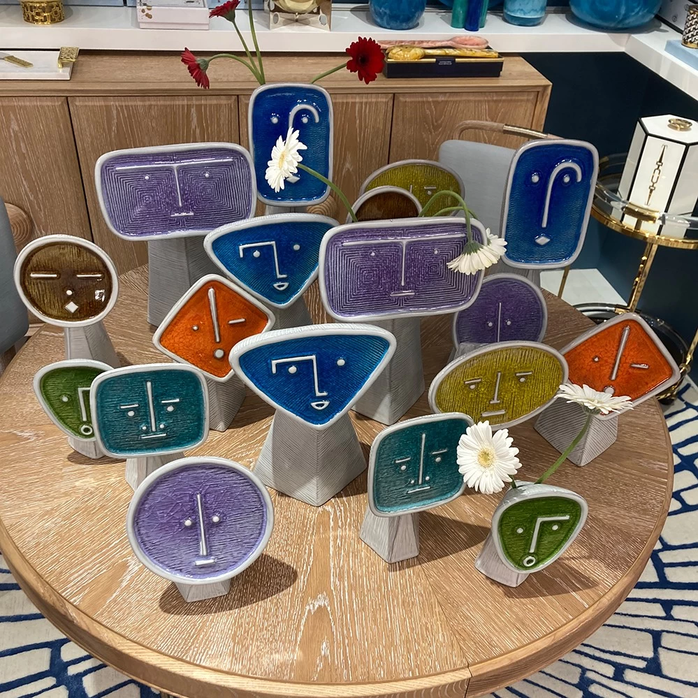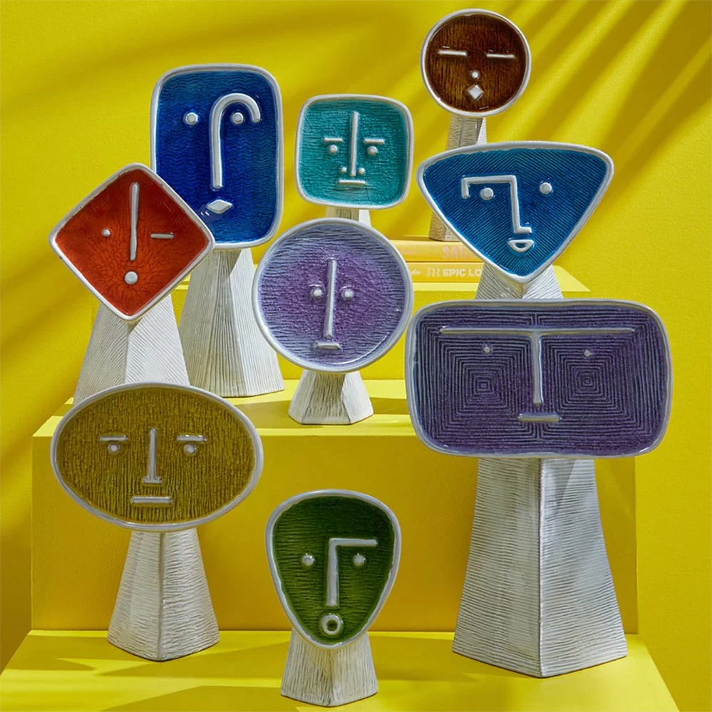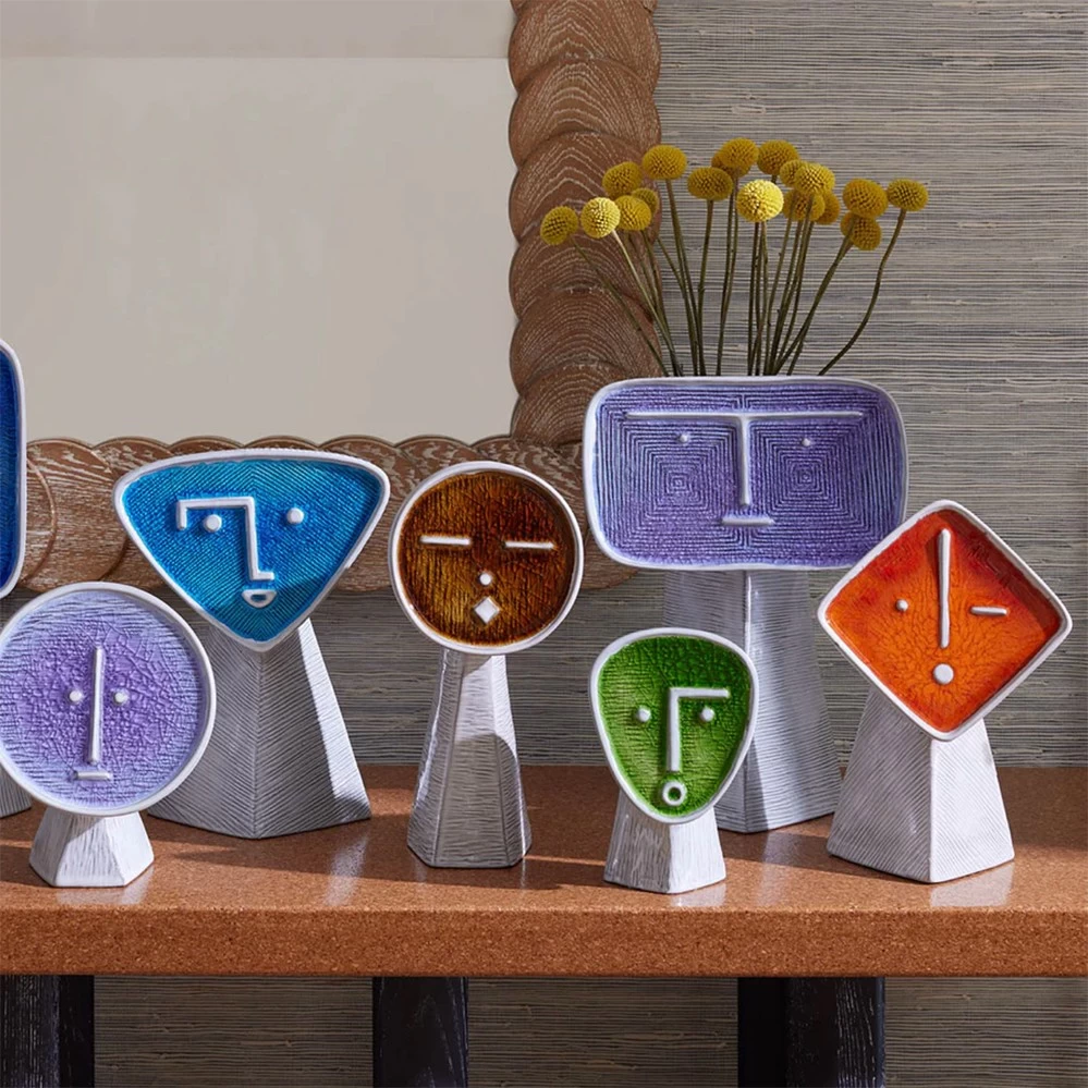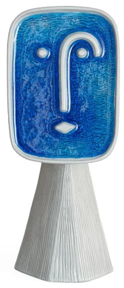 Die an ein Picasso-Gesicht erinnernde Vase Le Curieux zählt zu der neunteiligen Les Amis Vasenserie von Jonathan Adler, abstrakte Gesichter aus Steingut. Gedacht ist es, mehrere der sympatischen Freunde zu kombinieren. Die Les Amis Vasen zeigen ausdrucksstarke Gesichter, die in einem geschmolzenen Glas eingefasst sind, welches beim Abkühlen eine individuelles Craquelé-Finish erhält.