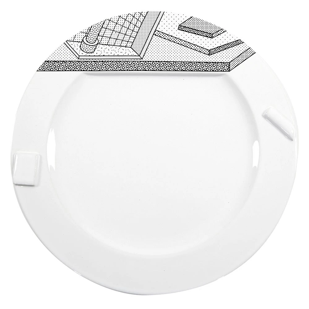 Neben Möbeln und Leuchten umfasst die Memphis Kollektion verschiedene Glas- und Keramikobjekte wie die Schmuckteller von Ettore Sottass. Dazu zählt der 30 cm große Teller Lettuce aus dem Jahr 1985 mit dem dekorativen Druck. Zusätzlich enthält die Serie noch den kleineren Teller Indivia und den Platzteller Rucola.