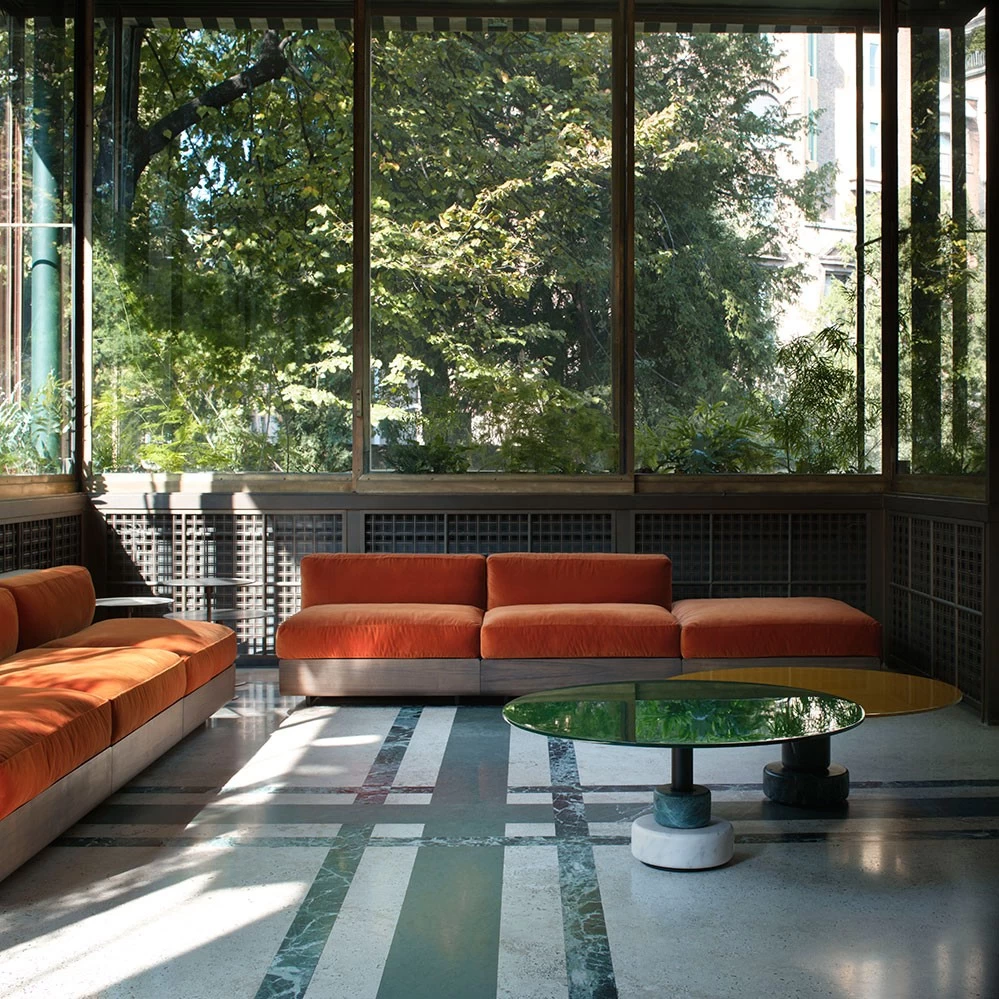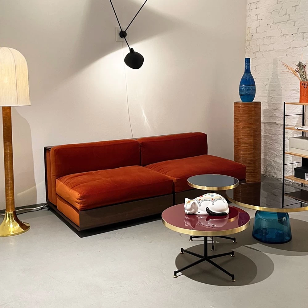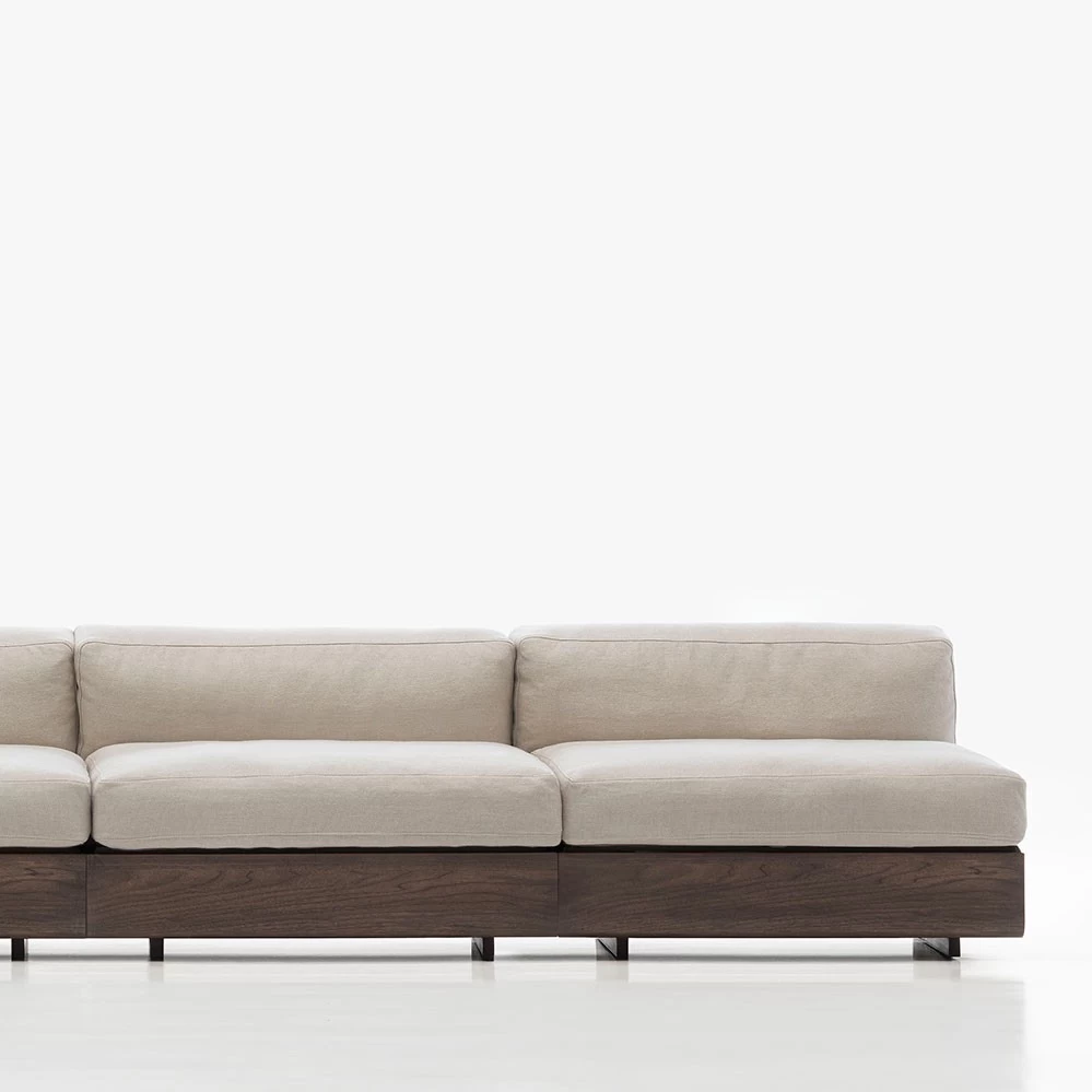 Das modulare Sitzsystem mit weicher Sitzfläche ist ein Entwurf des italienischen Architekten Roberto Monsani aus dem Jahr 1975 und entstand ursprünglich mit einer Sitzschale aus Acrylglas, einem damals recht avantgardistischen Material. Das Einzelelement kann wahlweise als Sessel verwendet werden oder endlos als Sofa verlängert werden. Formschön ist das Sitzsystem auch von hinten durch den Birkeholzkorpus in Esche oder Nussbaum. Neben dem angebotenen Samtstoff Opera ist Life bei Acerbis auf Anfrage noch in zahleichen weiteren Stoffen möglich.