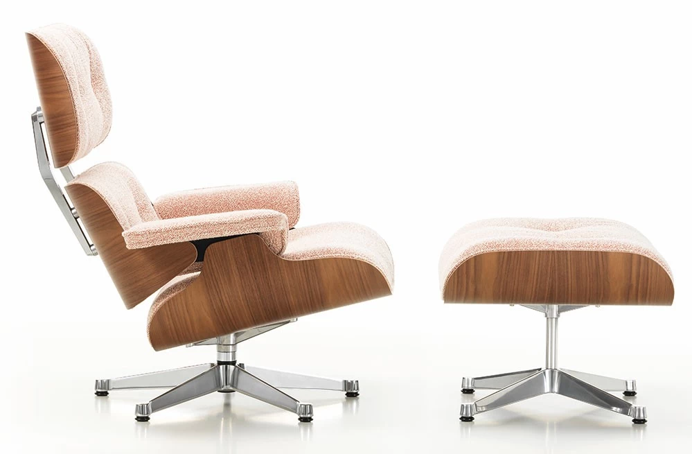 Der Eames Lounge Chair ist sicherlich der bekannteste Entwurf des Designer-Ehepaars und eine der wichtigsten Designikonen des 20. Jahrhunderts. Entworfen wurde die moderne Interpretation eines traditionellen Clubsessels bereits im Jahr 1956. Schon damals experimentierten die Eames mit unterschiedlichen Bezügen wie Leder und Stoff. Die mit Textilien bezogenen Lounge Chairs wurden aber bei Herman Miller nur innerhalb eines kurzen Zeitraums oder als Prototypen gefertigt. Die Konstruktion der Schale greift auf Elemente früherer Entwürfe von Charles und Ray Eames auf – wie bei den Möbeln der Plywood Group wurde für die Schale Schichtholz verwendet.