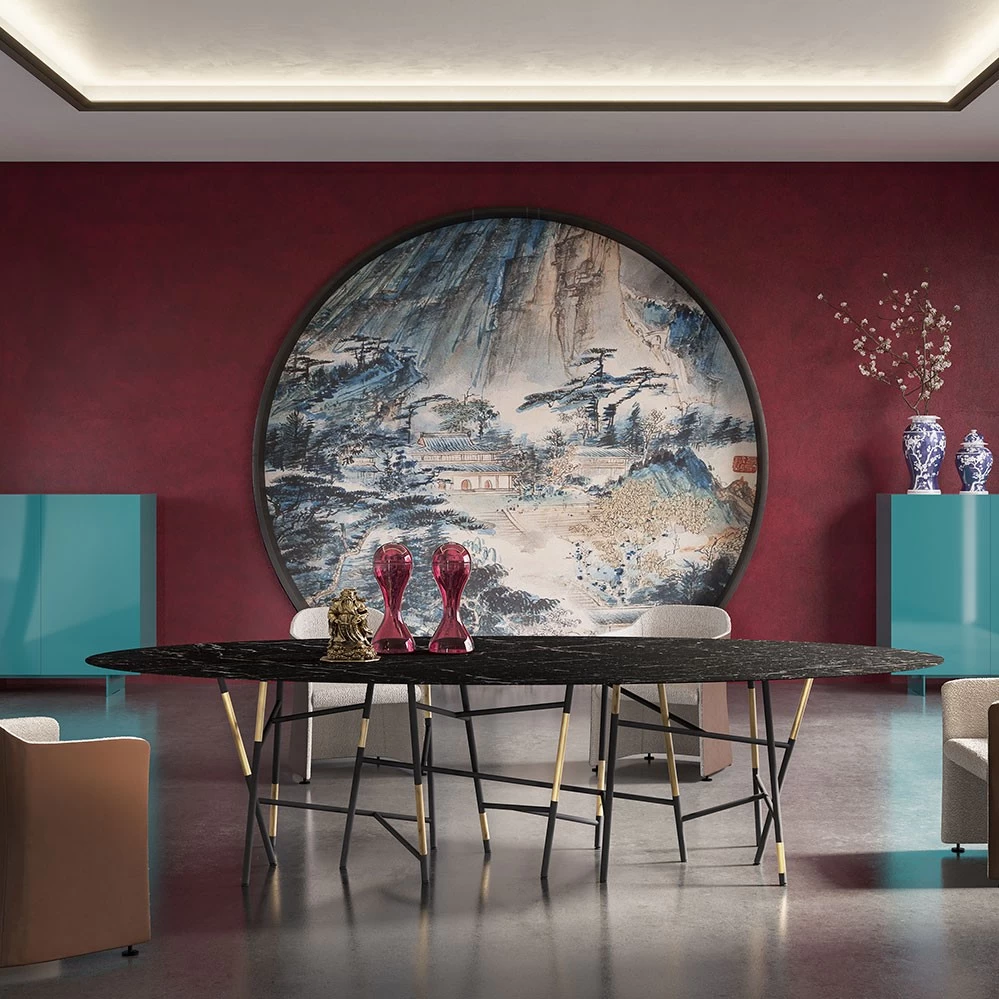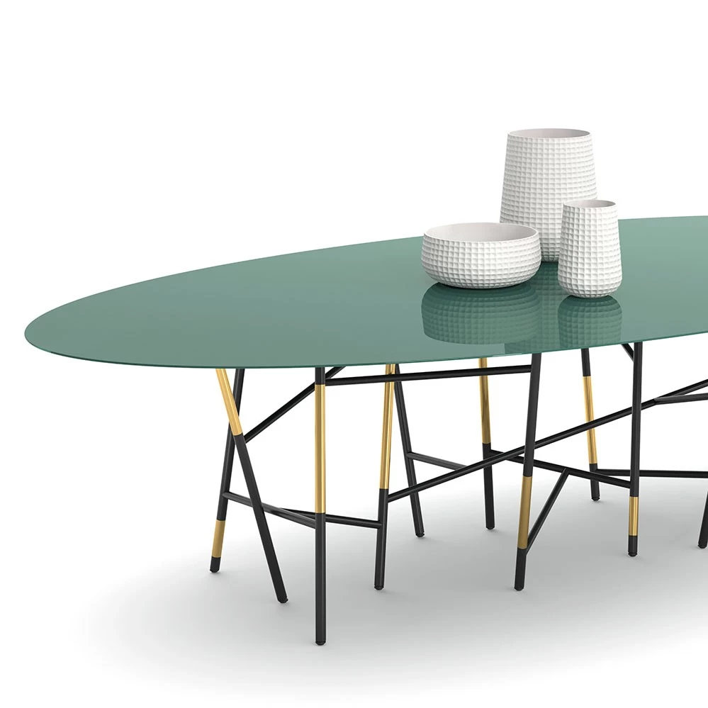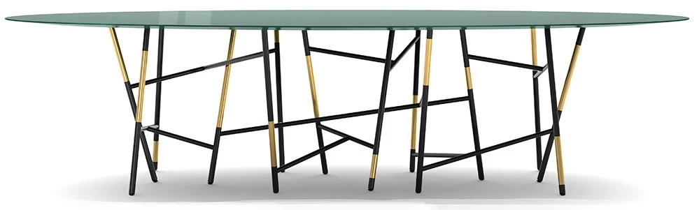 Für Cappellini entwarfen Dimorestudio 2023 diesen ovalen, 300 cm langen, Esstisch. Das Gestell ist aus schwarzem Metallrohren und Messingrohren, die Tischplatte des Millepiedi Esstisches aus einer matten oder glänzenden Holzfaserplatte oder aus Marmor.