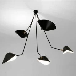 Bei der fünfarmigen Deckenleuchte „Araignée 5 Bras Cassès” von Serge Mouille können die fünf Reflektoren wahlweise nach oben, seitlich oder unten ausgerichtet werden. Serge Mouille entwarf seine Decken- und Wandsspinnen im Jahr 1954 und entwickelte damit einen eigenständigen Leuchtentyp.