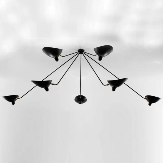 Bei der siebenarmigen Deckenleuchte oder Deckenspinne Araignée 7 Bras Fixes von Serge Mouille werden die Reflektoren primär nach oben für eine indirekte Lichtsituation ausgerichtet. Die dsieben unterschiedlich langen Arme der Lampe sind dabei fest in ihrer Position fixiert, die Reflektoren sind dafür bis 55 Grad schwenkbar und bis um 270 Grad drehbar .Serge Mouille entwarf seine Decken- und Wandsspinnen im Jahr 1954 und entwickelte damit einen eigenständigen Leuchtentyp.