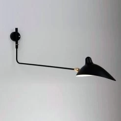 Die von Serge Mouille im Jahr 1954 entworfene einarmige Wandleuchte Applique 1 Bras Droit Pivotant wird heute als geschütztes Werk der angewandten Kunst exklusiv von der Editions Serge Mouille produziert. Die einarmige Wandleuchte ist zusätzlich noch mit einem abgewinkeltem Arm erhältlich. Der Reflektor erinnert von der Form an den weiblichen Busen und kann bis 55 Grad geschwenkt und bis um 270 Grad gedreht werden.