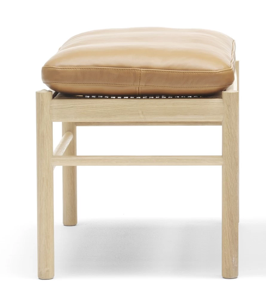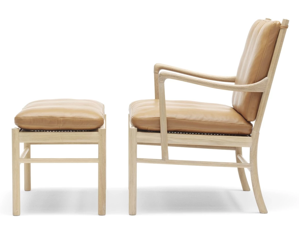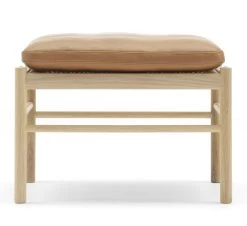 Passend zu seinem Colonial Chair entwarf Ole Wanscher 1949 als Ergänzung den passenden Hocker. Früher hergestellt von AJ Iversen, wird das Möbel nun seit einigen Jahren von Carl Hansen in Dänemark produziert. Neben der hier angebotenen klassischen Lederversion ist der Hocker auf Anfrage in Stoff erhältlich.