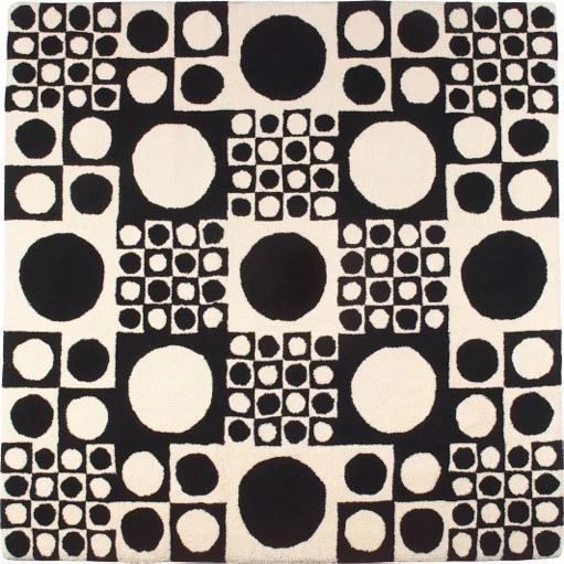 Das bekannteste Grafikdesign von Verner Panton ist sicherlich das Geometri-Dekor aus schwarz-weißen Kreisen und Quadraten, das zuerst ab 1961 von der dänischen Firma Unica Vaev als Teppich produziert wurde (später erfolgte eine Reedition des Vitra Design Museums). Bei der Inneneinrichtung des Restaurants Astoria in Trondheim verwendete Verner Panton das Op Art Dekor für Wände, Decken und Teppiche. Erhältlich ist der Panton Teppich in verschiedenen Größen, von denen wir exemplarisch das quadratische Format anbieten.