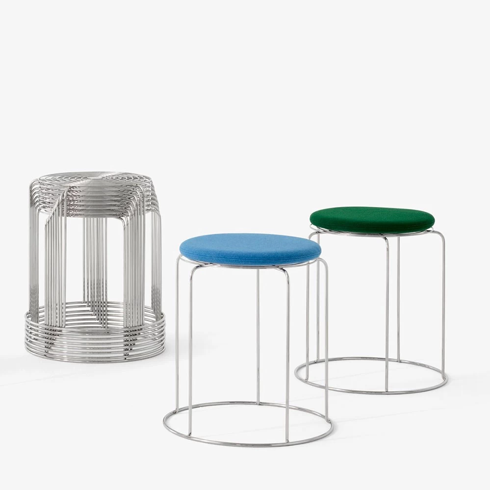 Der stapelbare Wire Stool ist ein späterer Entwurf von Verner Panton aus dem Jahr 1981, er erinnert formal an seine Drahtgittermöbel aus den 1970er Jahren. Das Möbel kann wahlweise als Hocker oder als Tisch verwendet werden, optional sind noch passende Sitzkissen bei andtradition erhältlich.