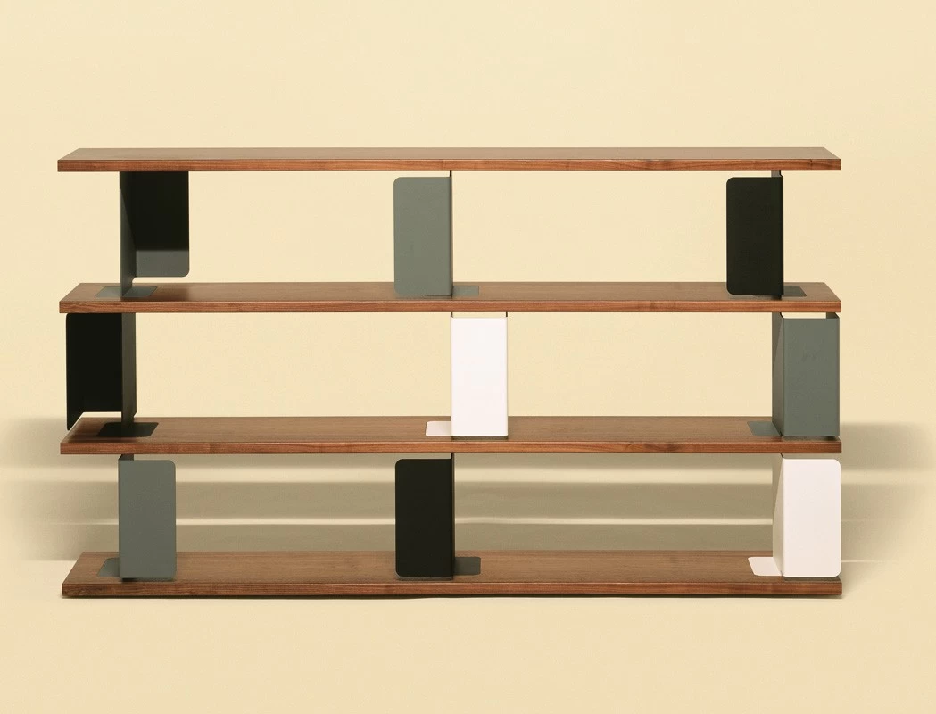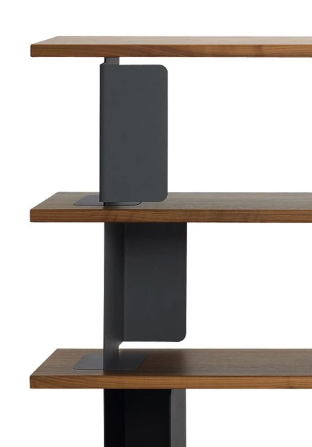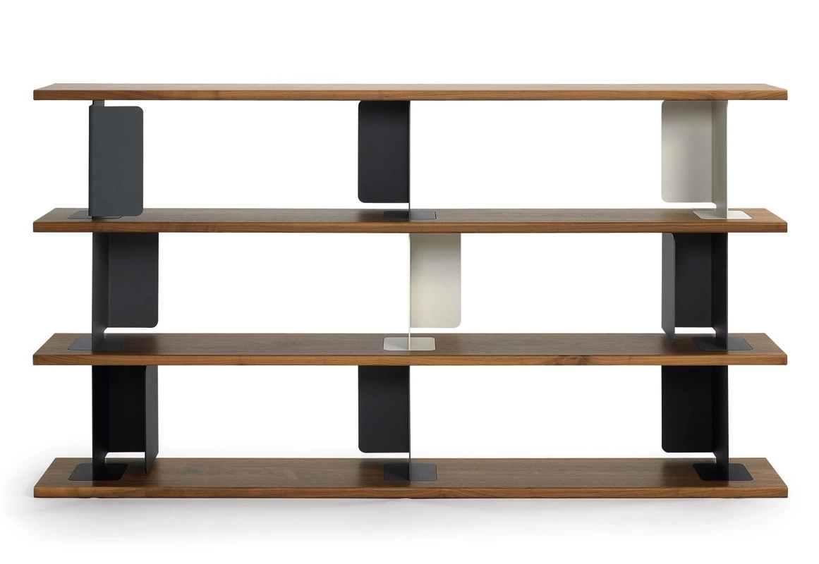 - Raumteiler (oder Regal) mit vier Regalböden aus lackiertem MDF (grauweiß oder schwarz) oder amerikanisches Nussbaumfurnier