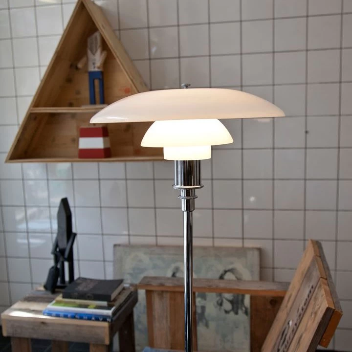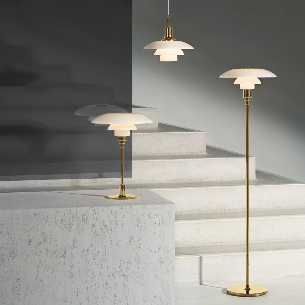 Die Stehleuchte PH 3½-2½ mit ihrem Glasschirm ist ein Entwurf von Poul Henningsen aus den 1930er Jahren und wird heute noch von Louis Poulsen produziert. Die PH-Leuchten fanden damals bei Architekten sehr viel Zuspruch und wurden häufig im Rahmen des Neuen Bauens eingesetzt. Selbst in der Villa Tugendhat von Ludwig Mies van der Rohe fanden sich die PH-Leuchten. Seit 2019 ist der Lichtklassiker wahlweise mit schwarz, verchromt sowie in Messing erhältlich.