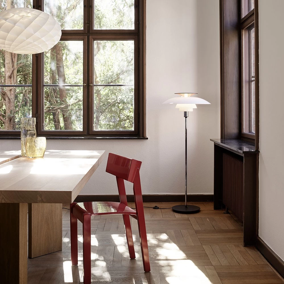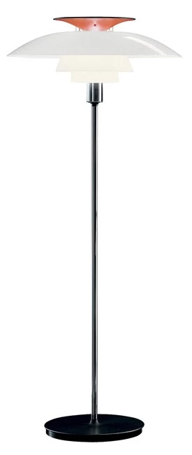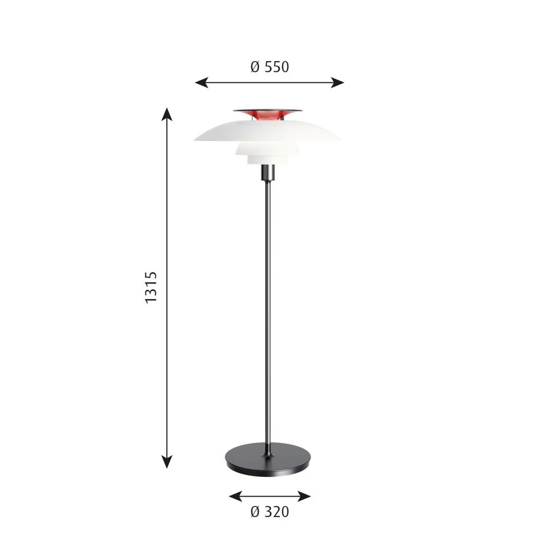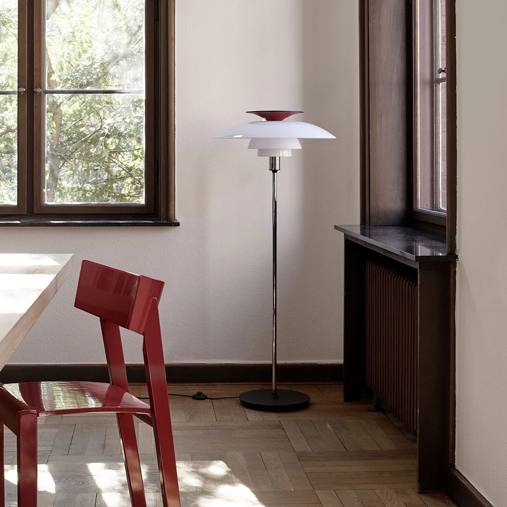 Die Stehleuchte PH 80 zählt zur PH Leuchtenserie (PH steht für die Initialen von Poul Henningsen) und verfügt über einen opalisierten Acrylglasschirm. Der primäre Teil des Lichts wird dabei nach unten geleitet, wobei die Acrylschirme ein angenehmes Raumlicht erzeugen. Die rote Farbe des oberen Reflektors verleiht dem Licht einen warmen Ton. Entwurf 1974.