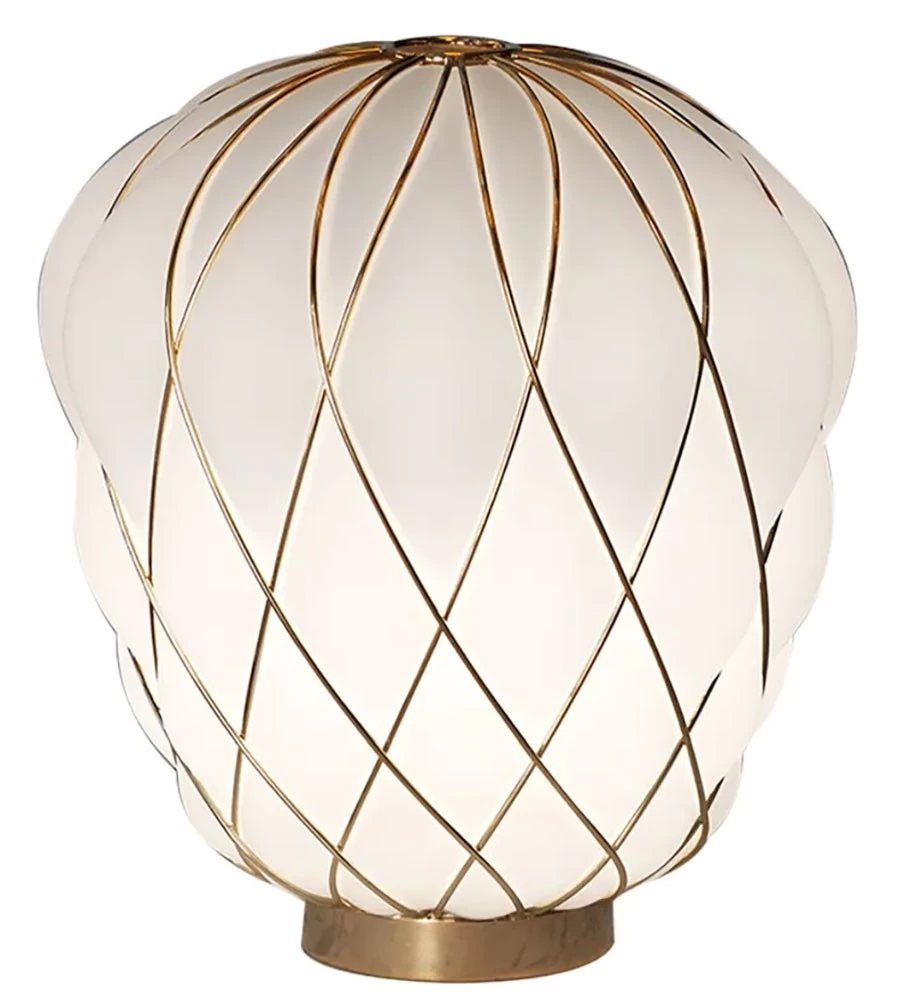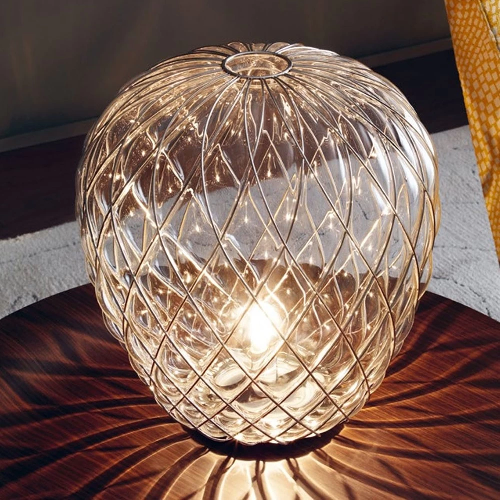 Die Tischleuchte Pinecone Media zählt zur der gleichnamigen Leuchtenserie, die die italienische Designerin Paola Navone 2016 für Fontana Arte entwarf. Die Serie erinnert an historische Leuchten aus den 1940er Jahren, auch die aufwendige Herstellung erfolgt in alter Glasbläserkunst: Der Glasbläser bläst die Glasblase mit dem Mund in einen Metallkorsett, das die natürliche Ausdehnung nur teilweise aufnimmt. Auf diese Weise wird das flüssige Glas teilweise von dem Korsett gehalten und entweicht teilweise, wodurch ein sehr interessantes Spannungsspiel entsteht. Vor allem die transparente Version der Pinecone erlaubt es dem Betrachter, eine doppelte Strukturebene zu erkennen. Im Gegensatz dazu folgt die weiße Version der Leuchte sanft der Korbform und unterstreicht die Geometrien, wobei sich ein elegantes und angenehmes diffuses Licht bildet. Es handelt sich um eine sehr suggestive Leuchte, die sowohl im eingeschalteten als auch im ausgeschalteten Zustand eine starke Wirkung hat. Ehältlich ist die Serie wahlweise als Tisch- oder Pendelleuchte in je zwei Größen und zwei Farbkombinationen.