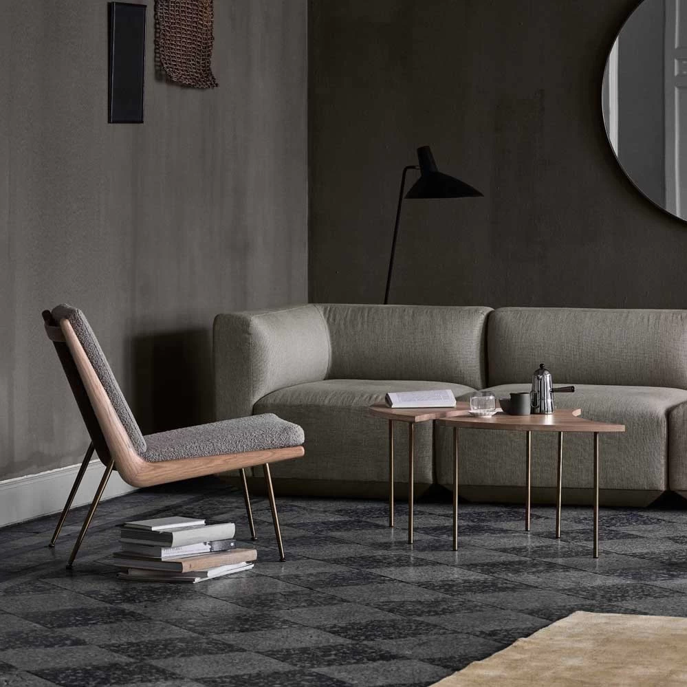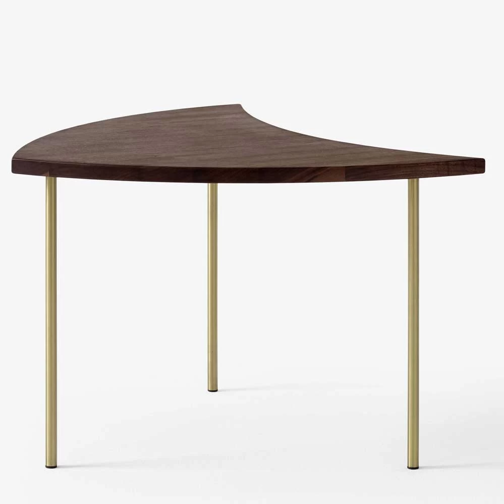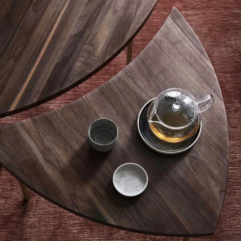Die erste Abbldung täuscht: Der dreieckige Pinwheel Couchtisch ist eigentlich als verlängerbarer Couchtisch gedacht. Das Konzept des dänischen Design- und Architekturbüros Hvidt & Mølgaard stammt aus dem Jahr 1953, der Tisch kann so verlängert werden oder einen überdimensionalen runden Couchtisch bilden. Die dünnen Füße sind dabei aus Messing gefertigt, die massive tischplate ist wahlweise in heller Eiche oder in Nussbaum. Preis pro Tisch.