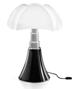 Die Pipistrello mit ihrem teleskopartigen Arm zählt zu den bekanntesten Entwürfen der italienischen Designerin und Architektin Gae Aulenti. Die Leuchte, hergestellt immer noch von Martinelli luce, lässt sich durch die Teleskopstange in der Höhe von 66 bis 86 cm verstellen. So ist die Pipistrello ideal für unterschiedliche Verwendungszwecke – von einer Tisch- und hin zur Leseleuchte. Der Entwurf des Designklassikers erfolgte bereits 1965, der Schirm ist aus dem Kunststoff Methacrylat, welches der Hersteller Martinelli luce häufig für die Leuchten von Elio Martinelli einsetzt.