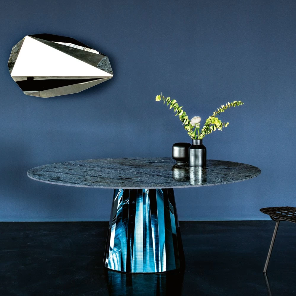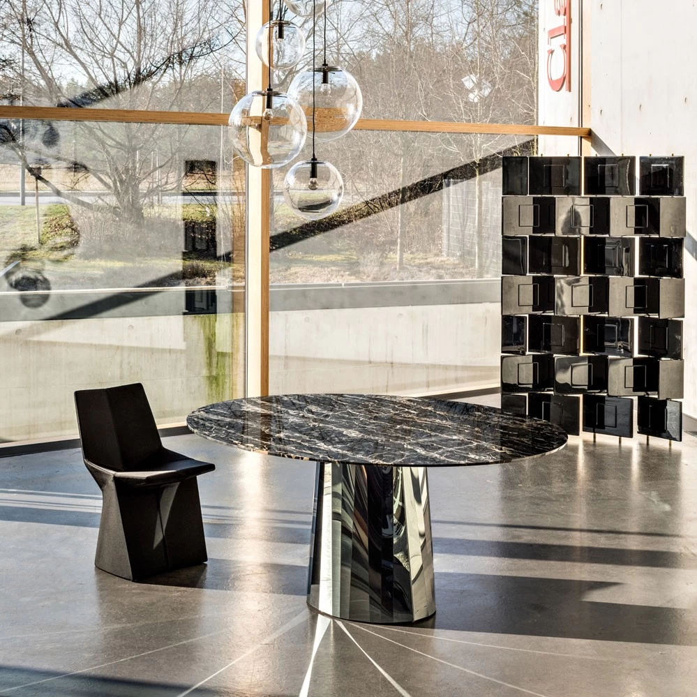 Bitte beachten Sie, dass der Pli Tisch sehr schwer ist, der Fuß wiegt ca. 100 kg, die Tischplatte je nach Marmorart weitere 200 kg!