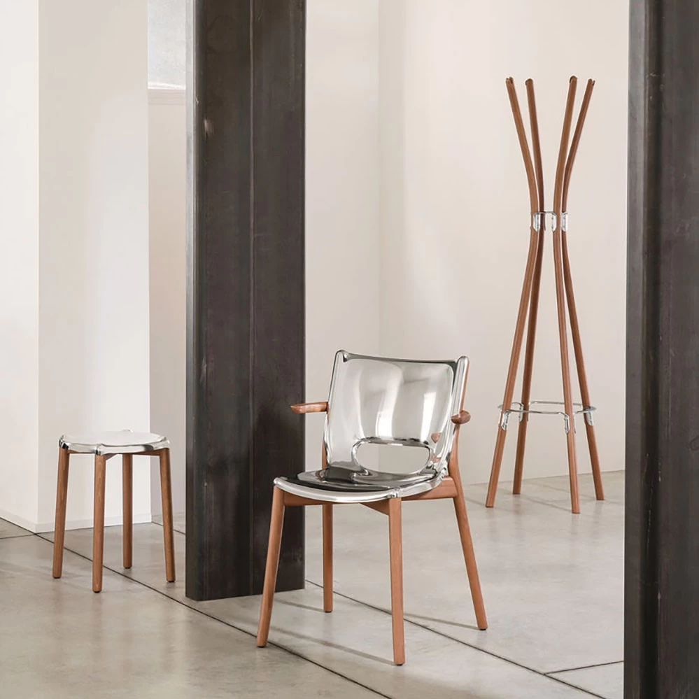 Die Grundlage der Poêle Möbelserie ist Alessis Erfahrung und Kompetenz in der Stahlverarbeitung. Diese Kunstfertigkeit kommt in der Verarbeitung der Möbel der Poêle Kollektion zum Ausdruck, bei denen das Metall eine überraschend fließende Materialität annimmt: Das Stahlblech erscheint weich und umhüllt auf harmonische Weise die Teile aus Holz. Das Ergebnis ist eine Serie von starker Identität,, dies ich in Umgebungen unterschiedlichster Stilrichtungen ein, vom Wohnbereich über das Büro bis hin zu hochwertigen Objektmöbeln.