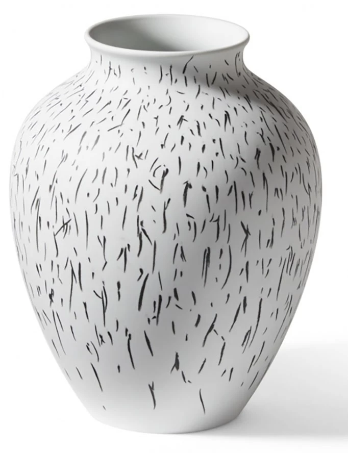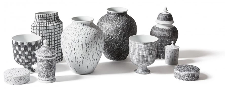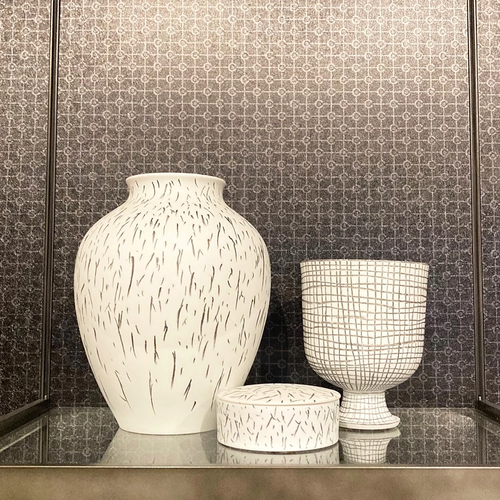 Die Orcino-Vase GNF 02 mit dem Strichdekor ist Bestandteil der handbemalten Post Scriptum Porzellankollektion von Formafantasma. Die Serie entstand im Jahr 2022 in Zusammenarbeit mit dem Porzellanhersteller Richard Ginori und Cassina, weitere Objekte der Serie gerne auf Anfrage (siehe zweite Abbildung).