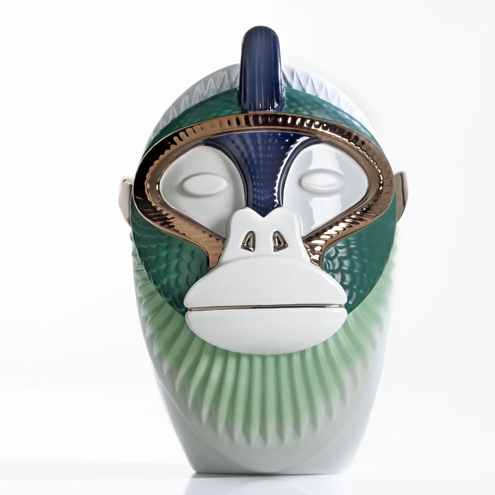 Die 41 cm hohe Primates Kandti Vase von Elena Salmistraro zeigt das Gesicht einer Goldmeerkatze und zählt zu der gleichnamigen Keramkserie von Bosa und wurde – neber der ikonischen Mickey Mouse – zu einer Art Wahrzeichen der Manufaktur. Die Vasen sind laut der Künstlerin eine zeitgenössische Neuinterpretation antiker römischer Keramik, die bekannt für ihren animistischen Charakter ist. Das Motiv der Affen soll dabei die Ähnlichkeit zum Menschen vermitteln. Erhältlich ist die Serie mit den bunten Affengesichtern wahlweise als Vase oder als Wandobjekt. Dabei erlaubt das Konzept von Elena Salmistraro verschiedene Farbvarianten des jeweiligen Motivs, wie beispielhaft auf der zweiten Abbildung.