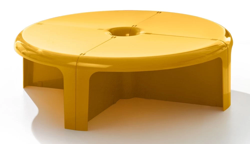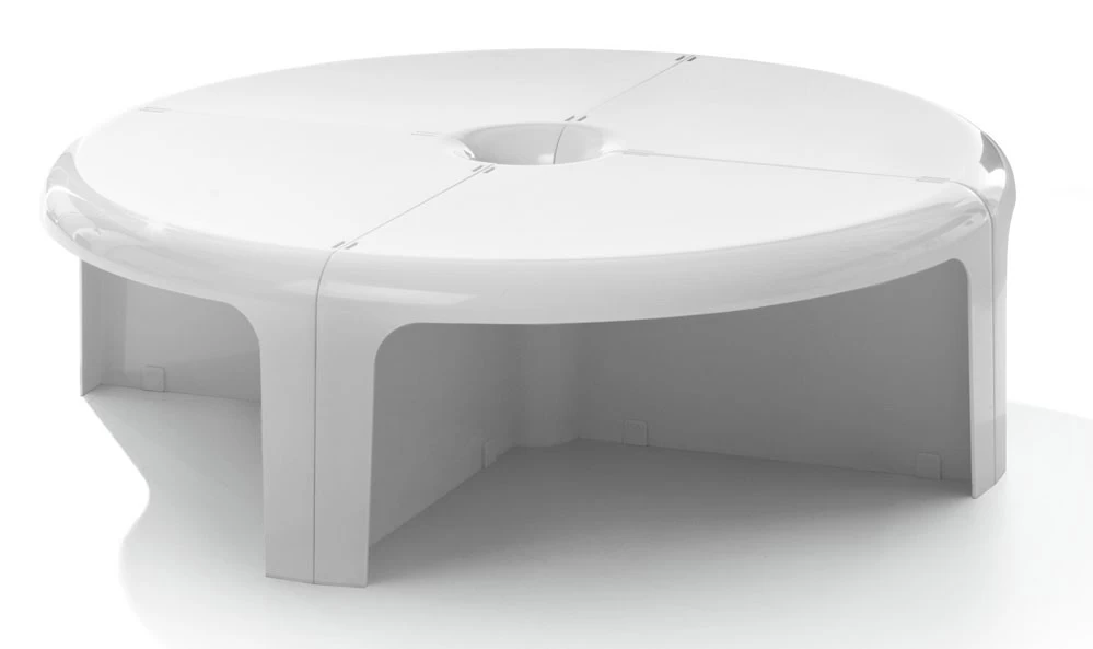 Der Quattro Quarti 4/4 von Rodolfo Bonetto ist ein typisches Multifunktionsmöbel der 1960er Jahre und kann sowohl als Tisch oder in Regal Verwendung finden. Denn die vier einzelnen Elemente können auf unterschiedlichste Weise zusammengesetzt werden. So lässt sich aus Quattroquarti 4/4 wahlweise ein runder Couchtisch formen, ein Couchtisch in Schleifenfom oder ein kleines Regal.