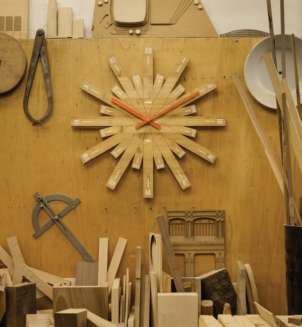 Die Wanduhr MDL05 Raggiante wurde 2017 von Michele De Lucchi für Alessi entworfen und wird aus Bambusholz gefertigt. Raggiante (italienisch für „strahlend“) steht für die Sonne, die uns die Stunden angibt, auch wenn sie nicht zu sehen ist und sich hinter der Erde versteckt. Michele De Lucchi bevorzugt meist natürliche Materialien, die sich mit der Zeit verändern und verbessern: Mit Bambusholz haucht er hier einem Industrieprodukt Leben ein, dessen Eigenschaften sich eher zwischen Kunst und Kunsthandwerk bewegen. Lesen Sie mehr zu der Wanduhr in unserem Blog.