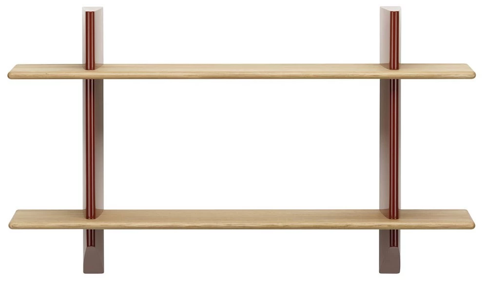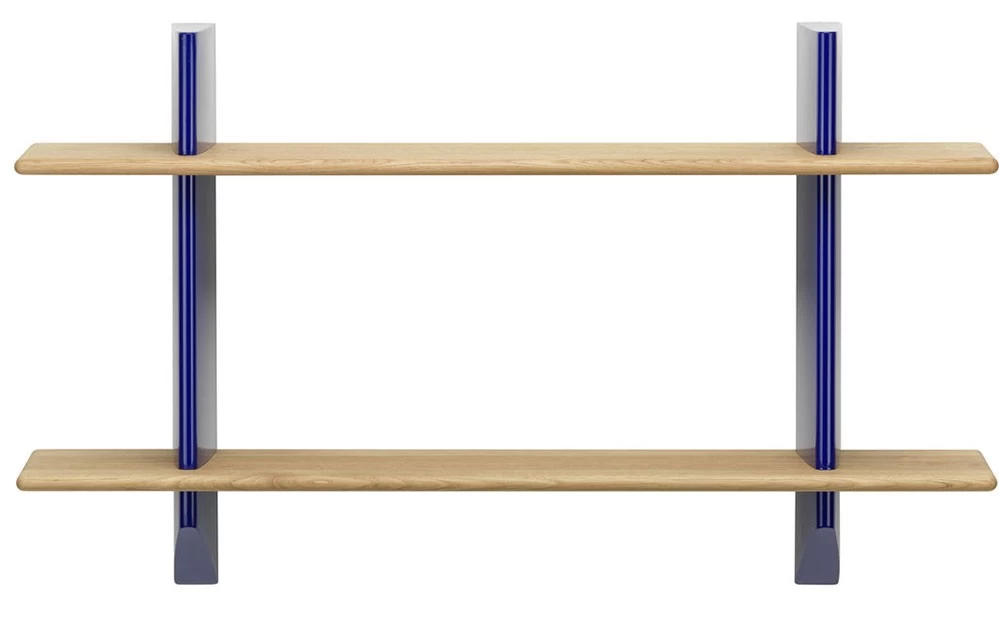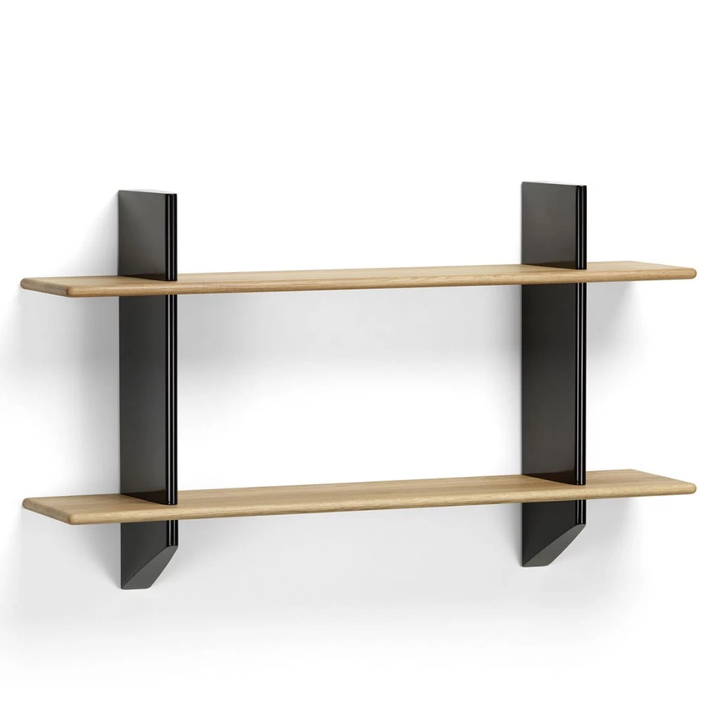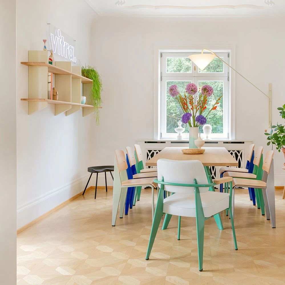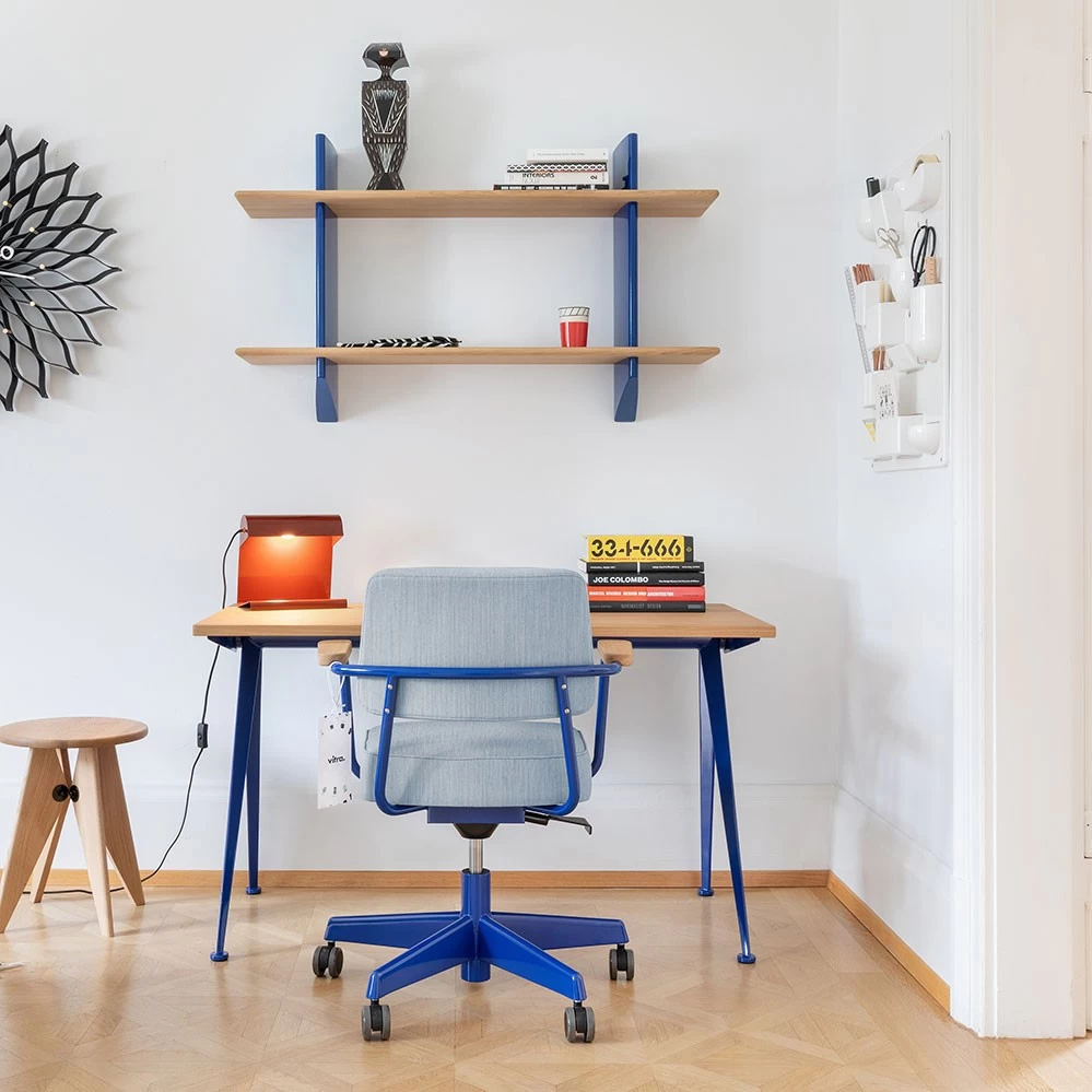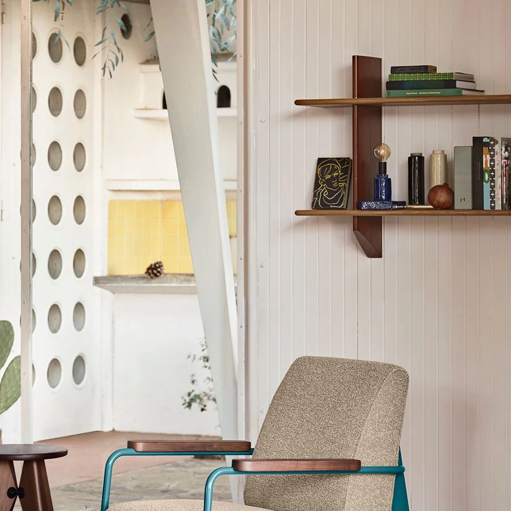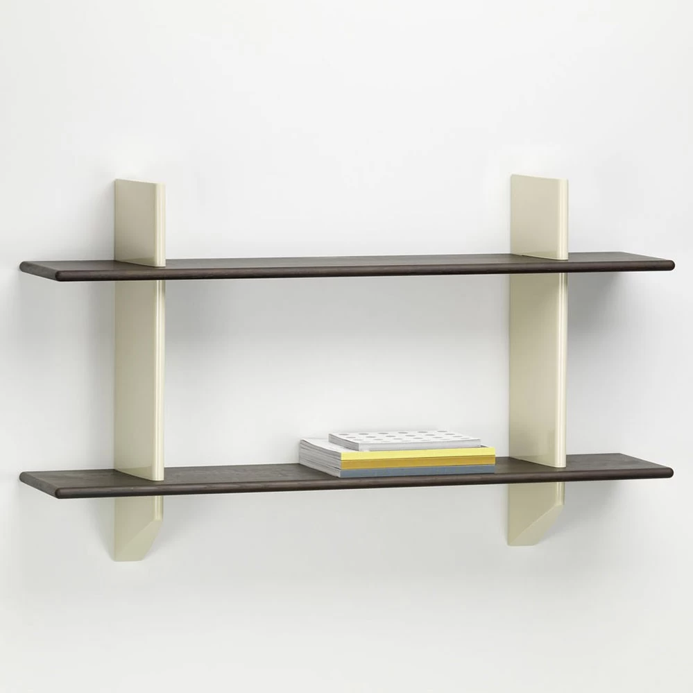 Das kleine Wandregal von Jean Prouvé stammt aus den 1930er Jahren und wurde von Vitra 2022 erneut aufgelegt. Klein dimensionierte Wandregale sind heute vergleichsweise selten, in der Mitte des 20. Jahrhunderts beschäftigten sich jedoch einige bedeutende Gestalter mit dieser Möbeltypologie – so auch Jean Prouvé. An vielen Stellen der Wohnung – etwa über dem Sofa oder über dem Esstisch – einsetzbar, ist das Rayonnage Mural dabei mehr als nur praktischer Stauraum. Die an Flügel eines Flugzeugs erinnernden Träger aus umgeformtem Blech und die weich gerundeten Kanten der Massivholzborde machen das wohlproportionierte Regal zu einer wahren Wandskulptur.