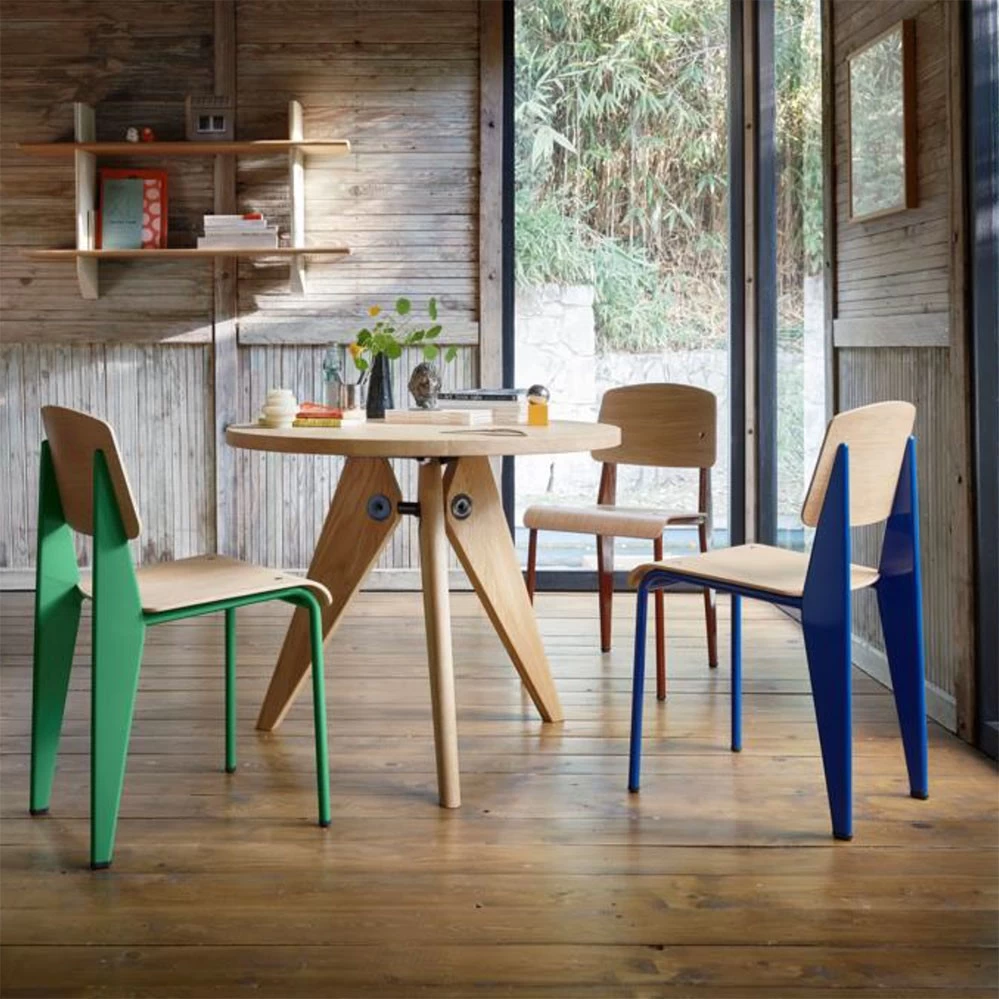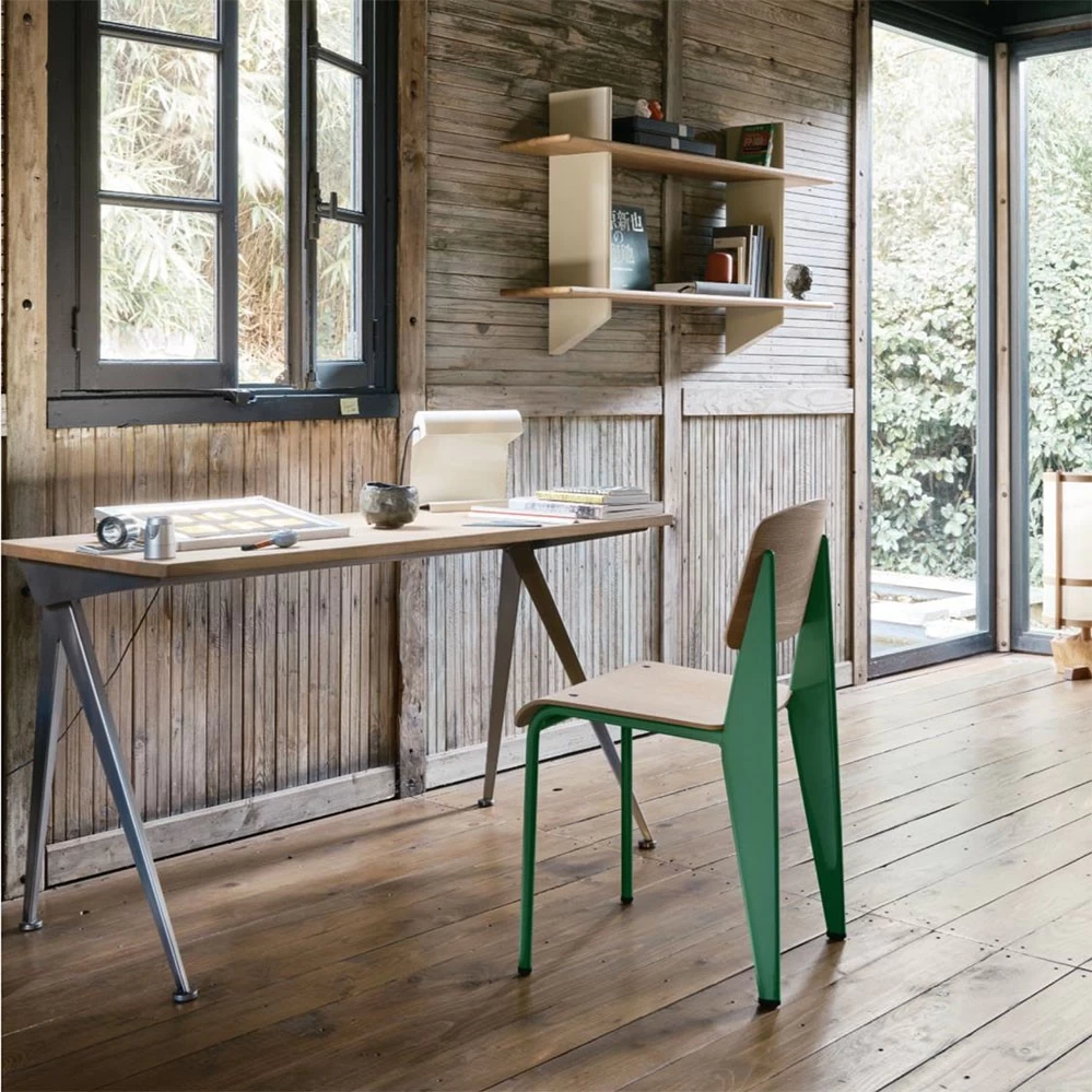 Jean Prouvés Möbelentwürfe entstanden in der Zeit von 1924 bis 1956 und waren in ihrer Funktionalität am Bedarf der Zeit ausgerichtet – einfach, langlebig und preiswert. Gefertigt wurden sie damals meist in Kleinauflagen in seiner eigenen Manufaktur (Les Ateliers Jean Prouvé), der Vertrieb erfolgte über die Pariser Galerie Steph Simon. Im Gegensatz zu den Entwerfern am Bauhaus, die häufig mit Stahlrohr experimentierten, arbeitete Prouve primär mit umgeformtem Stahlblech. Seine aus der Automobil- und Flugzeugindustrie gewonnenen Fertigungskenntnisse prägten dabei formale Details ebenso wie die Gesamterscheinung. Zusammengeschraubtes und Montiertes sind Ausdruck seines konstruktiven Entwurfsprinzips.
