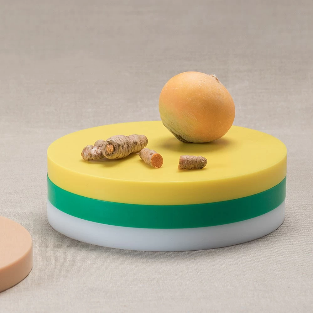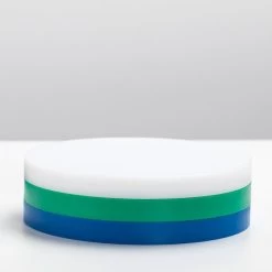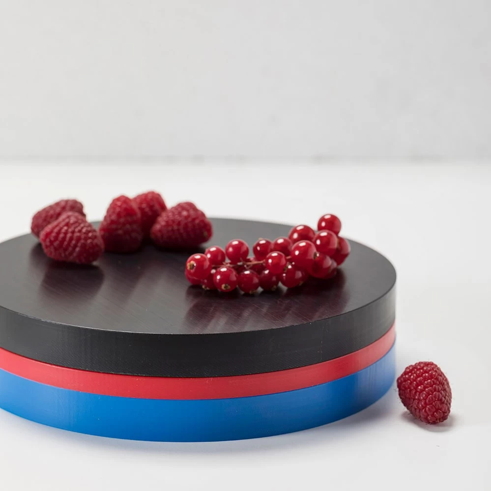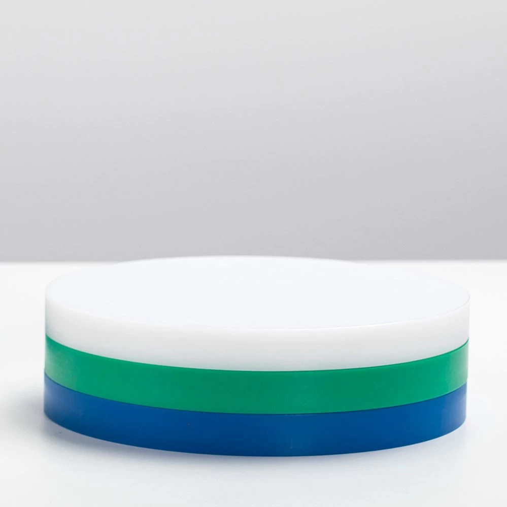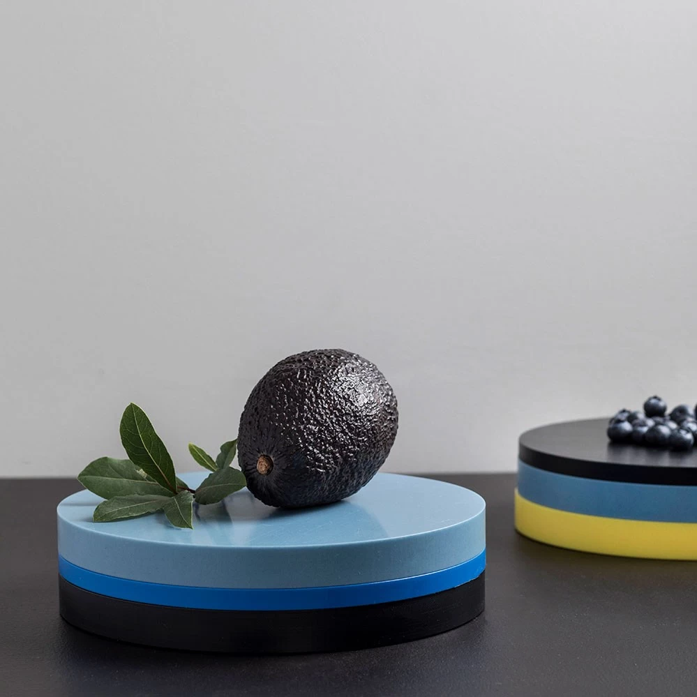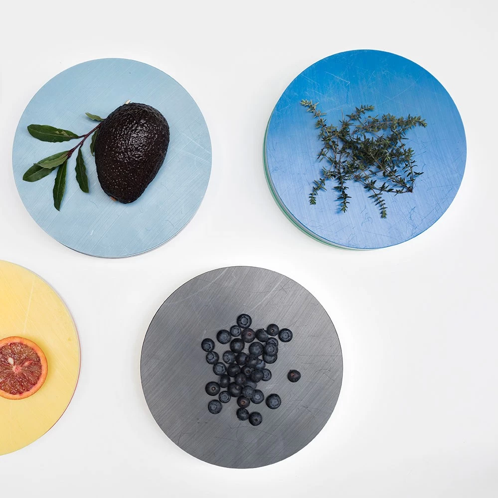 2021 legt valerie_objects die limitierte RE-Circles Edition von Muller Van Severen auf. Jedes Set besteht aus drei unterschiedlich farbigen Speiseunterlagen (gedacht als Scheidebretter oder Tabletts) aus Polyethylen in den typischen Muller Van Severen-Farbenwelten, wie sie bei dem Serienprodukt Five Circles verwendet werden. Es handelt es sich dabei um den Polyethylen-Restbestand, der bei der Serienpoduktion der Five Circles anfällt. Im Gegensatz zu den Five Circles mit je 2 cm Höhe pro Scheibe haben die RE-Circles drei unterschiedliche Höhen (1 cm, 1,5 cm und 2 cm). Gestapelt wirken die drei Scheiben wie eine farbige Skulptur auf dem Esstisch, die Farbzusammenstellung pro Set ist rein zufällig (siehe Fotos).*