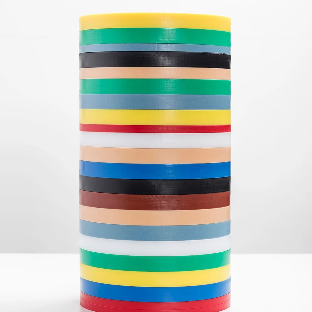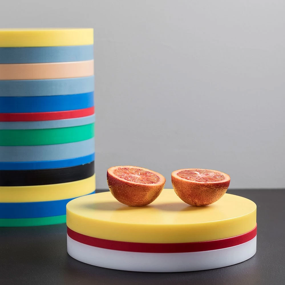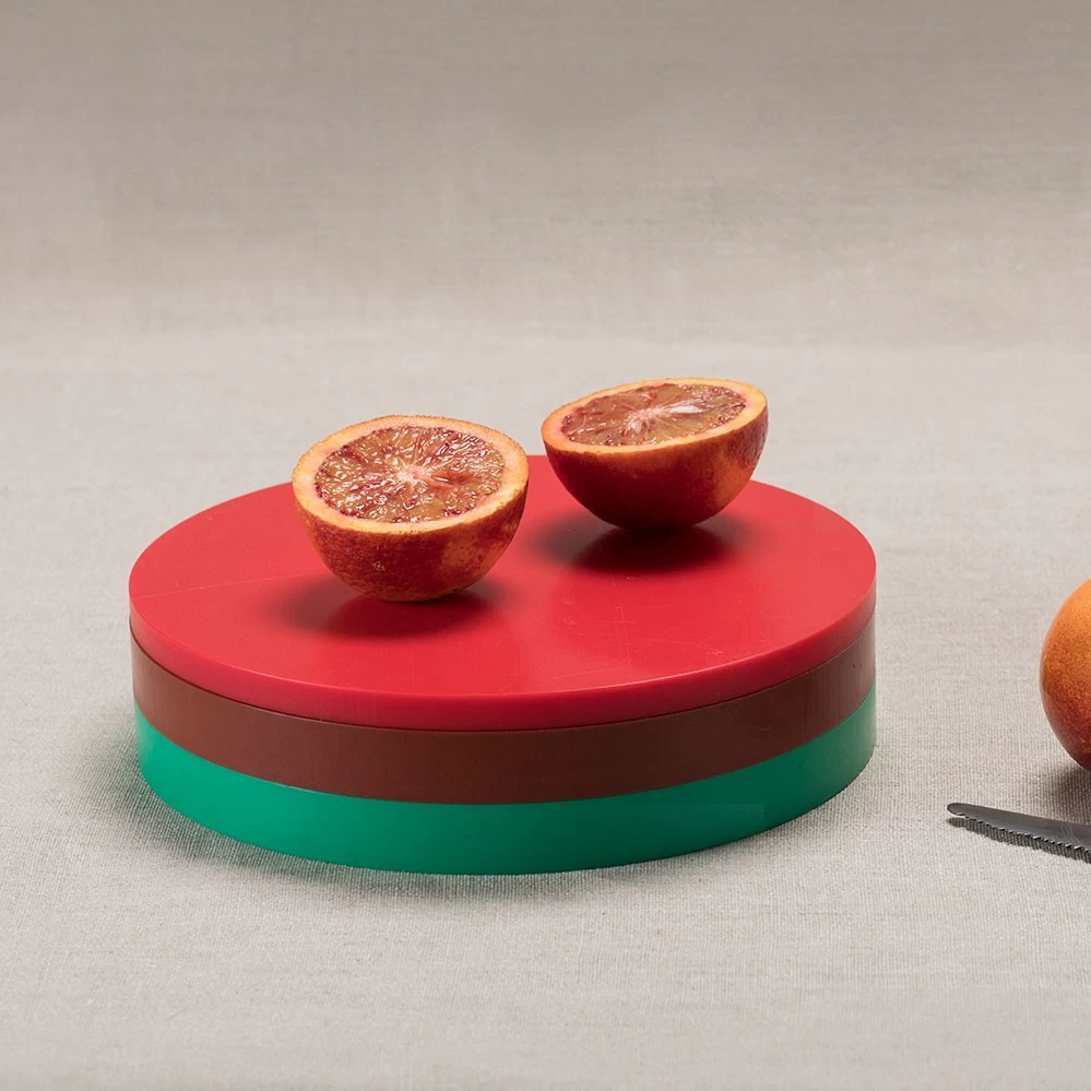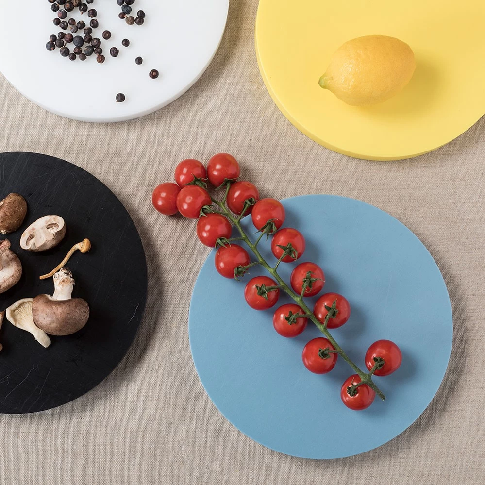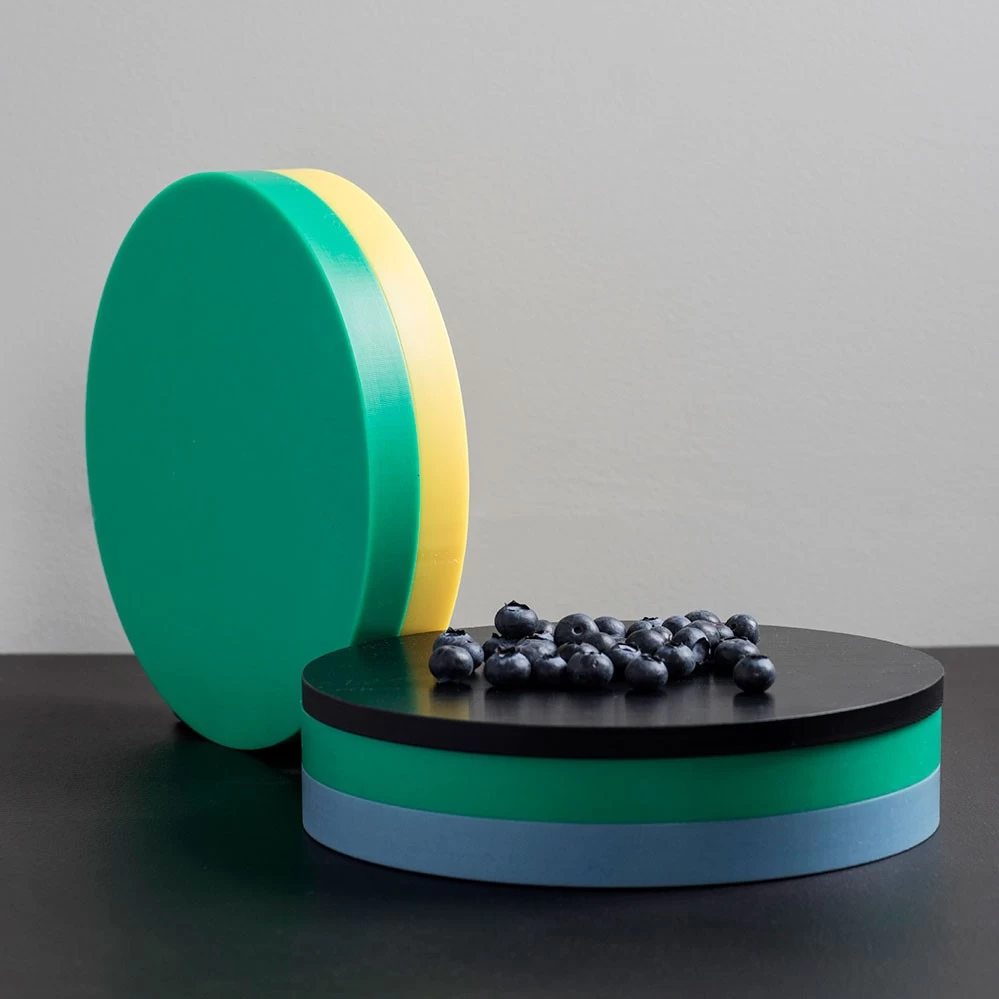 2021 legt valerie_objects die limitierte RE-Circles Edition von Muller Van Severen auf. Jedes Set besteht aus drei unterschiedlich farbigen Speiseunterlagen (gedacht als Scheidebretter oder Tabletts) aus Polyethylen in den typischen Muller Van Severen-Farbenwelten, wie sie bei dem Serienprodukt Five Circles verwendet werden. Es handelt es sich dabei um den Polyethylen-Restbestand, der bei der Serienpoduktion der Five Circles anfällt. Im Gegensatz zu den Five Circles mit je 2 cm Höhe pro Scheibe haben die RE-Circles drei unterschiedliche Höhen (1 cm, 1,5 cm und 2 cm). Gestapelt wirken die drei Scheiben wie eine farbige Skulptur auf dem Esstisch, die Farbzusammenstellung pro Set ist rein zufällig (siehe Fotos).*