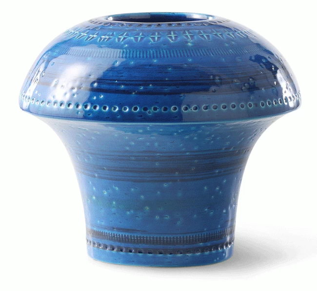 2013 ergänzte Bitossi die Rimini Blu Kollektion um einige Objekte wie die Rimini Blu Vase 195. Aldo Londis sicherlich bekanntester Entwurf ist die Keramik-Kollektion Rimini Blu, die zwischen 1957 und 1965 entstand. Die Kollektion umfasst über 150 Entwürfe, von Schalen, Vasen, Aschenbechern bis hin zu Tierfiguren in unterschiedlichen Formen und Größen. Gemeinsam sind bei allen Entwürfen das charakteristische Muster und die blaue Glasur. Markanto zeigt beispielhaft eine kleine Auswahl, weitere Objekte gerne auf Anfrage.