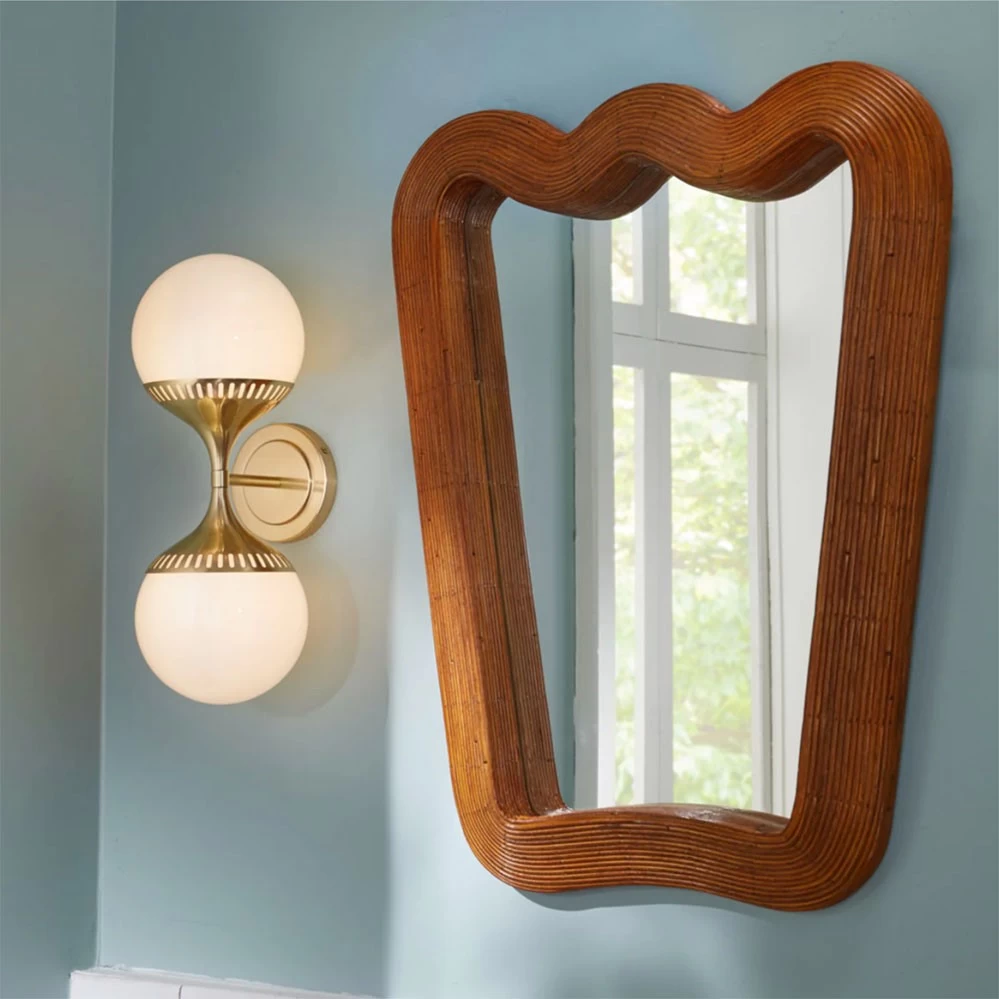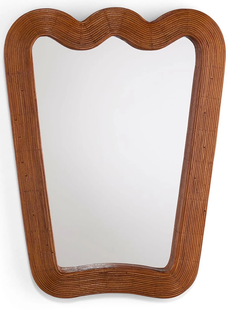 Der Riviera Spiegel von Jonathan Adler aus dem Jahr 2022 ist von französischen Möbeln der 1950er Jahre inspiriert. Naturmaterialien wie Rattan oder Kork erfreuen sich aktuell großer Beliebtheit und werden von verschiedensten Designern und Herstellern wieder gerne verwendet.