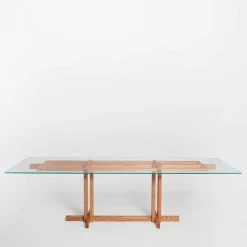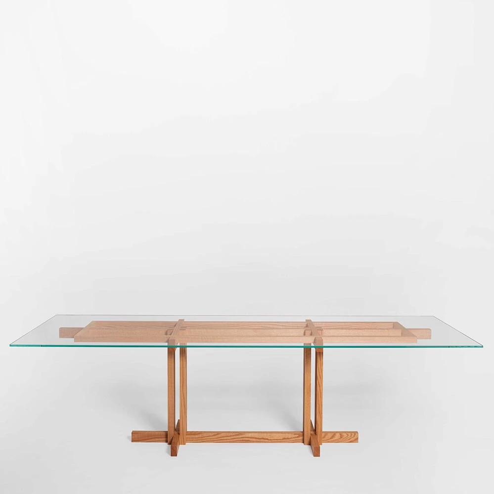 - Tischplatte Glas, Gestell Roteiche massiv, geölt