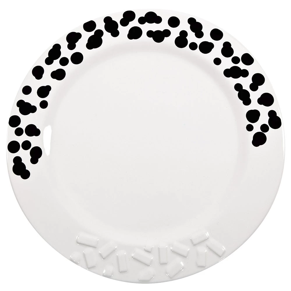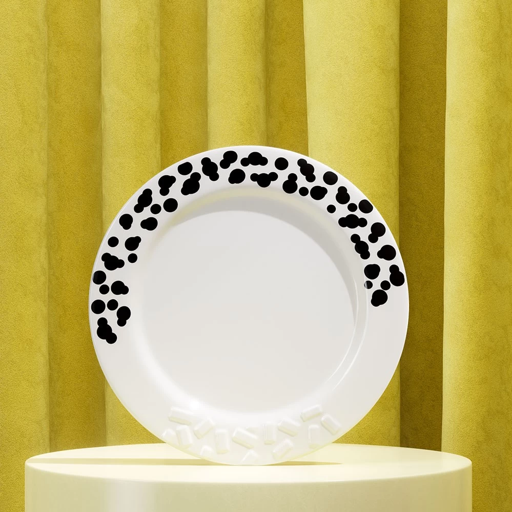 Neben Möbeln und Leuchten umfasst die Memphis Kollektion verschiedene Glas- und Keramikobjekte wie die Schmuckteller von Ettore Sottass. Dazu zählt der 30 cm große Platzteller Rucola aus dem Jahr 1985 mit dem dekorativen Druck. Zusätzlich enthält die Serie noch den kleineren Teller Indivia und den Platzteller Lettuce.