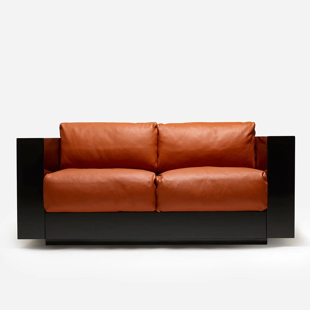 Das kubische Sofa Saratoga ist ein Entwurf des italienischen Architekturbüros Vignelli Associates aus dem Jahr 1964. Erhältlich ist das Sofa wahlweise als 2-Sitzer, 3-Sitzer oder 4-Sitzer und optional als Sessel. Neben der hier gezeigten ursprünglichen, orangefarbigen Lederposterung ist das Saratoga Sofa auf Anfrage in fünf weiteren Lederfarben bei Poltronova erhältlich.