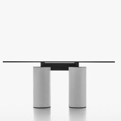 Die klare Linienführung verleiht dem quadratischen Serenissimo Tisch ein graphisches Erscheinungsbild mit vier Säulen und einer horizontalen Stange aus Stahl, welche die Glaslatte in einem schwebeartigen Zustand hält. Der Schreibtisch oder Esstisch ist ein Entwurf des italienischen Ehepaars Lella und Massimo Vignelli aus dem Jahr 1985 und mit verschiedenen Glasplatten (transparent, opal oder schwarzes Gussglas) bei Acerbis erhältlich.