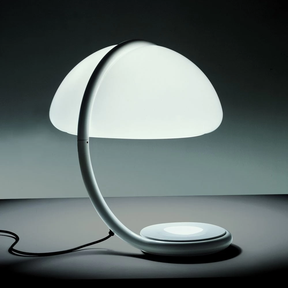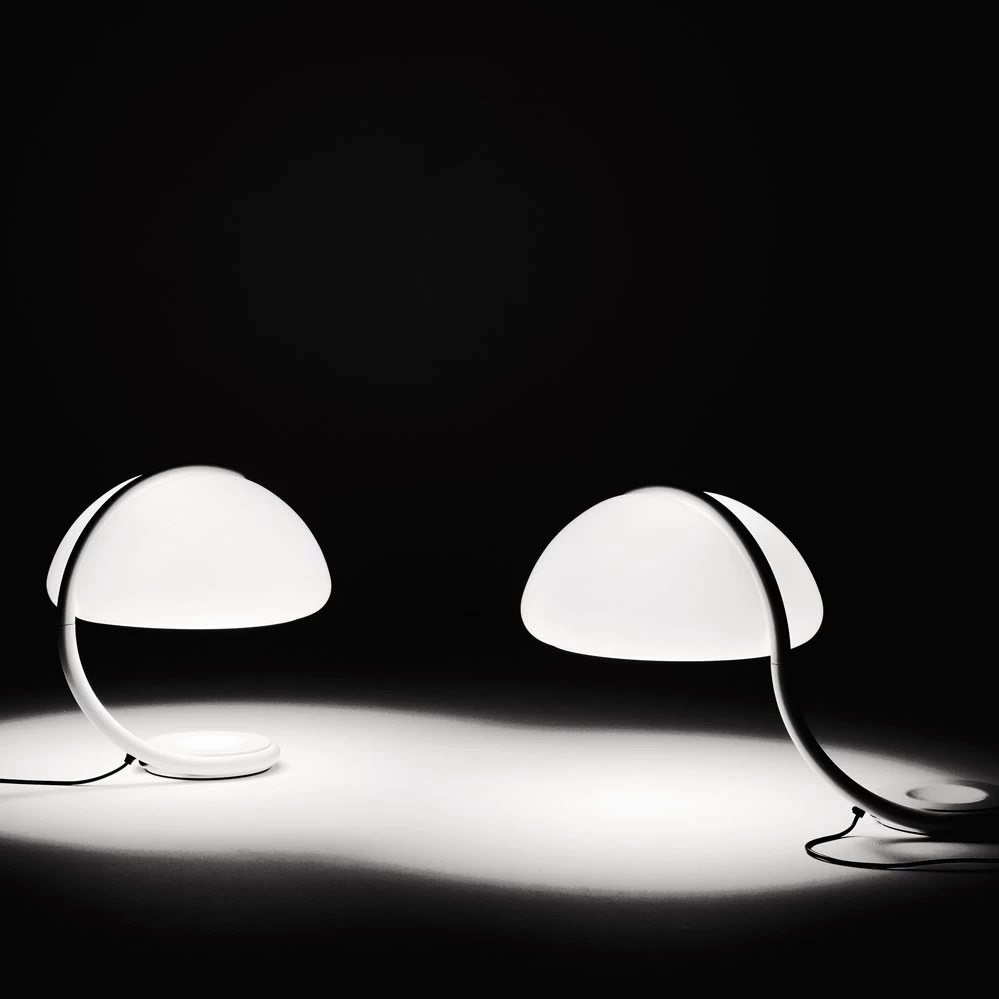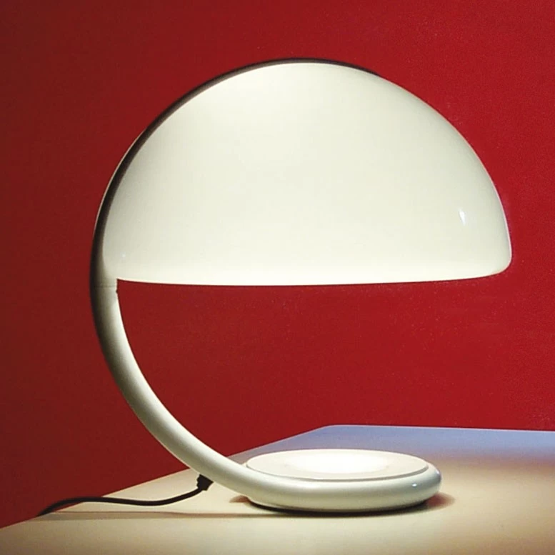 1965 entwarf Elio Martinelli die beiden Leuchten der Serpente Serie, die sich durch ihren drehbaren Reflektor auszeichnen. Noch heute wird die Tischleuchte von seiner eigenen Firma Martinelli luce produziert. Als Werkstoff für seine Leuchtenentwürfe setzte Martinelli meist den Kunststoff Methacrylat ein, das opale Material verleiht den Leuchten eine transparente Anmutung und sorgt für ein warmes Licht. Der Schirm der Serpente Tischleuchte lässt sich fast beliebig drehen, wodurch dieser Entwurf zum italienischen Klassiker der 1960er Jahre wurde.