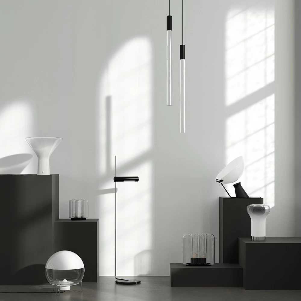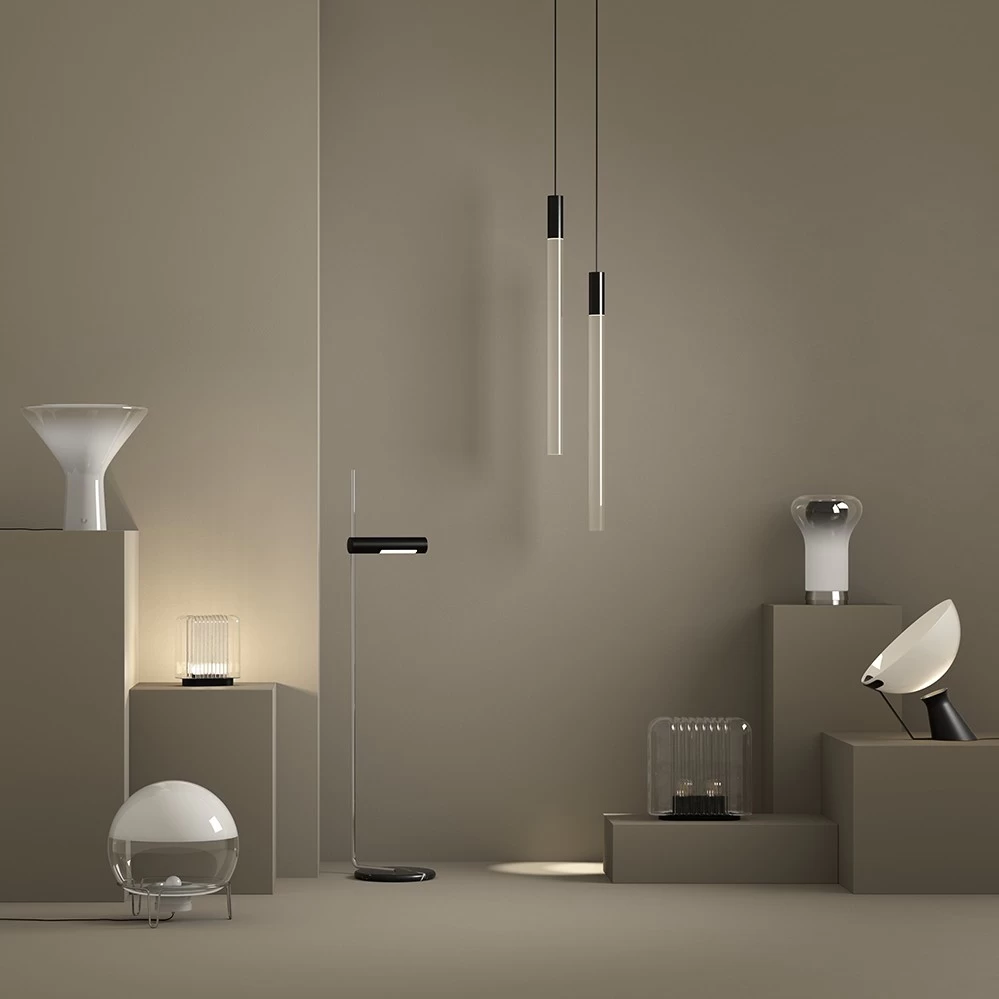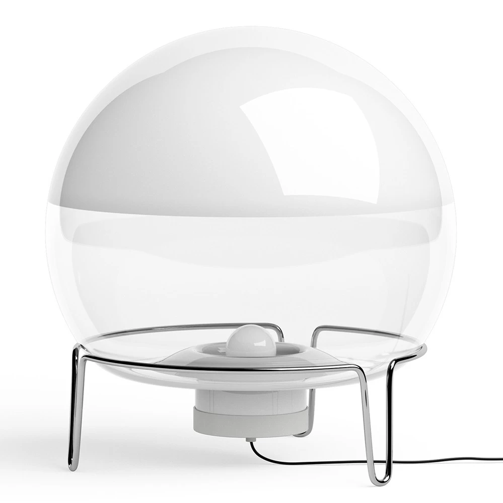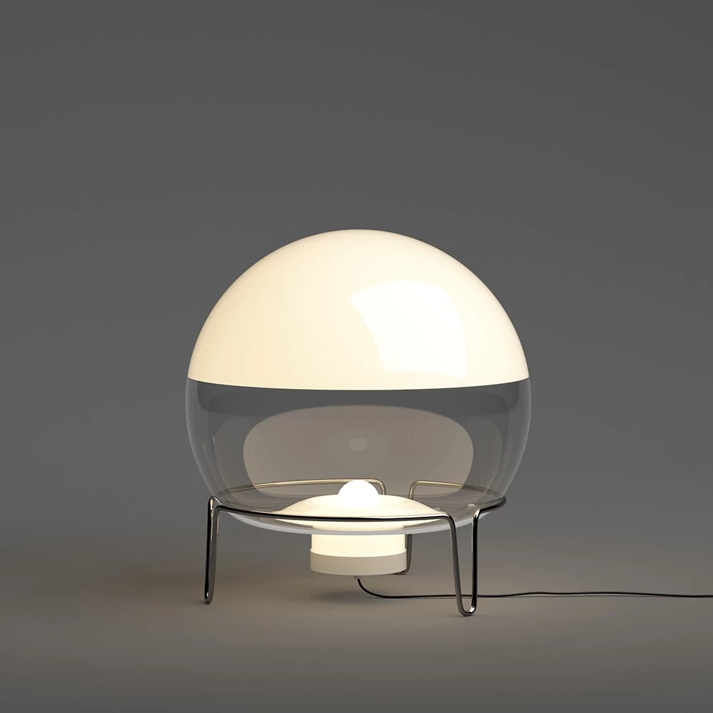 Die Sfera Tischleuchte ist ein Entwurf von Angelo Mangiarotti aus dem Jahr 1968. Der Reflektor besteht aus einem mundgeblasenem Glaskörper, welcher auf dem Stahlgestell ruht.