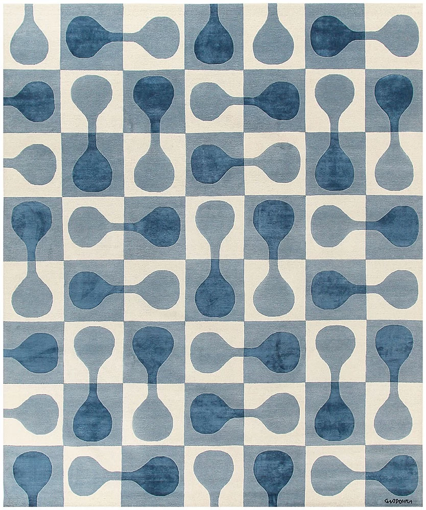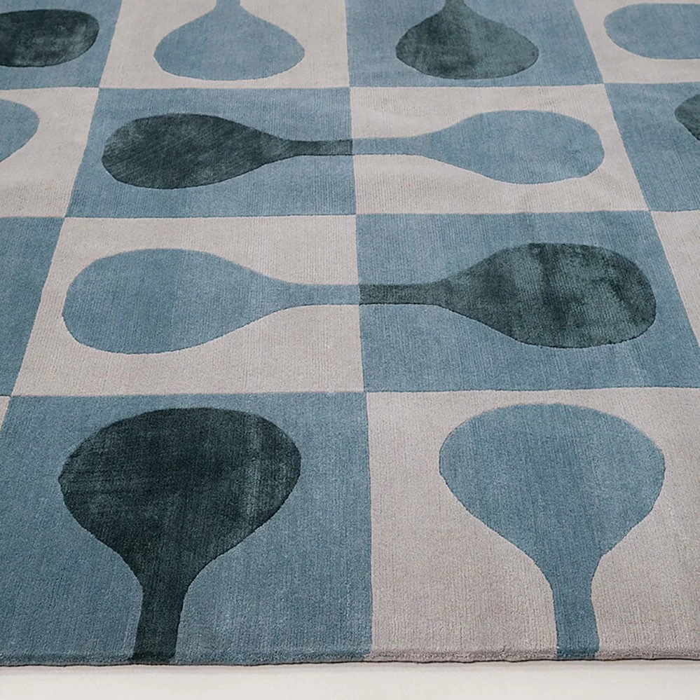 Das Dekor des Teppichs Sorrento von Amini basiert auf Gio Pontis blauen Fliesen aus dem berühmten Hotel Parco dei Principi in Sorrent. Der Teppich wird bei Amini aus Seide und Wolle in Nepal hergestellt und ist zwei verschiedenen Farbausführungen lieferbar.
