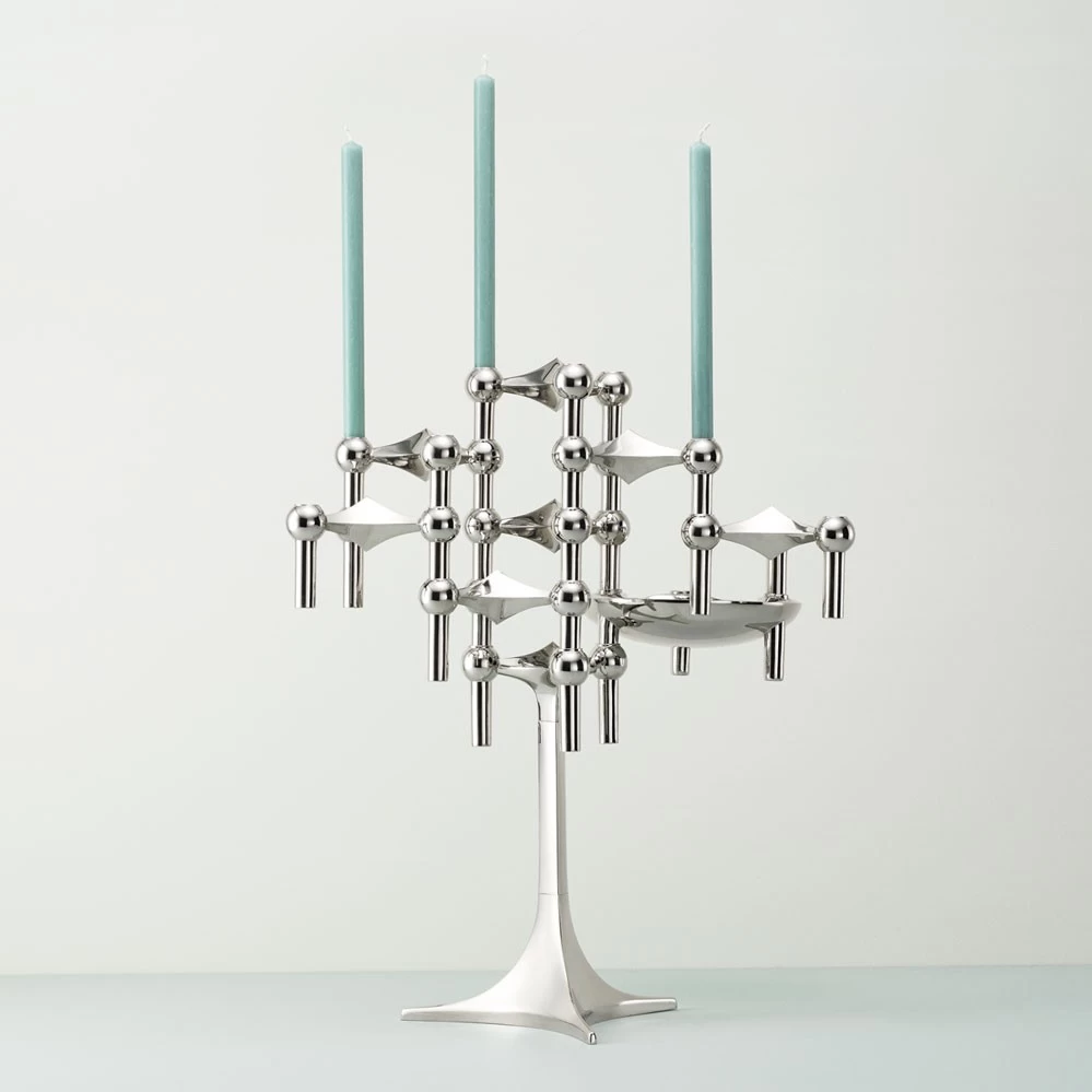Passend zu seinem Kerzenständer entwarf der deutsche Architekt Werner Stoff auch die passende Basis. Der dreibeinige Fuß verleiht dem Stecksystem die Anmutung eines kleines Metallbaums. Zusätzlich ist noch die passende Schale erhältlich – wahlweise verchromt, schwarz beschichtet oder in Messing.