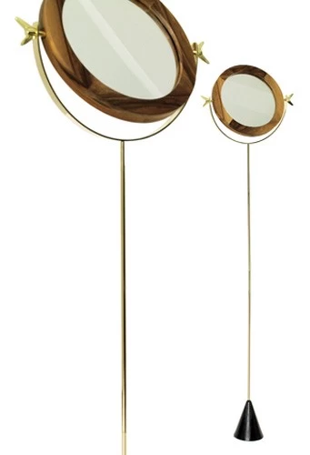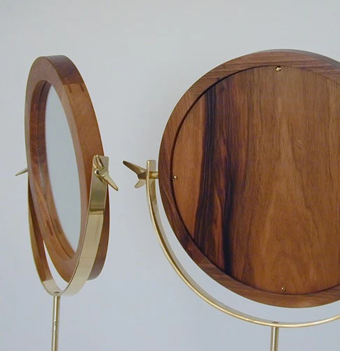 Der sehr elegante Carl Auböck Standspiegel 4959 mit einem Rahmen aus Nussbaum ermöglicht durch die Messingschrauben eine einfache Justierung.