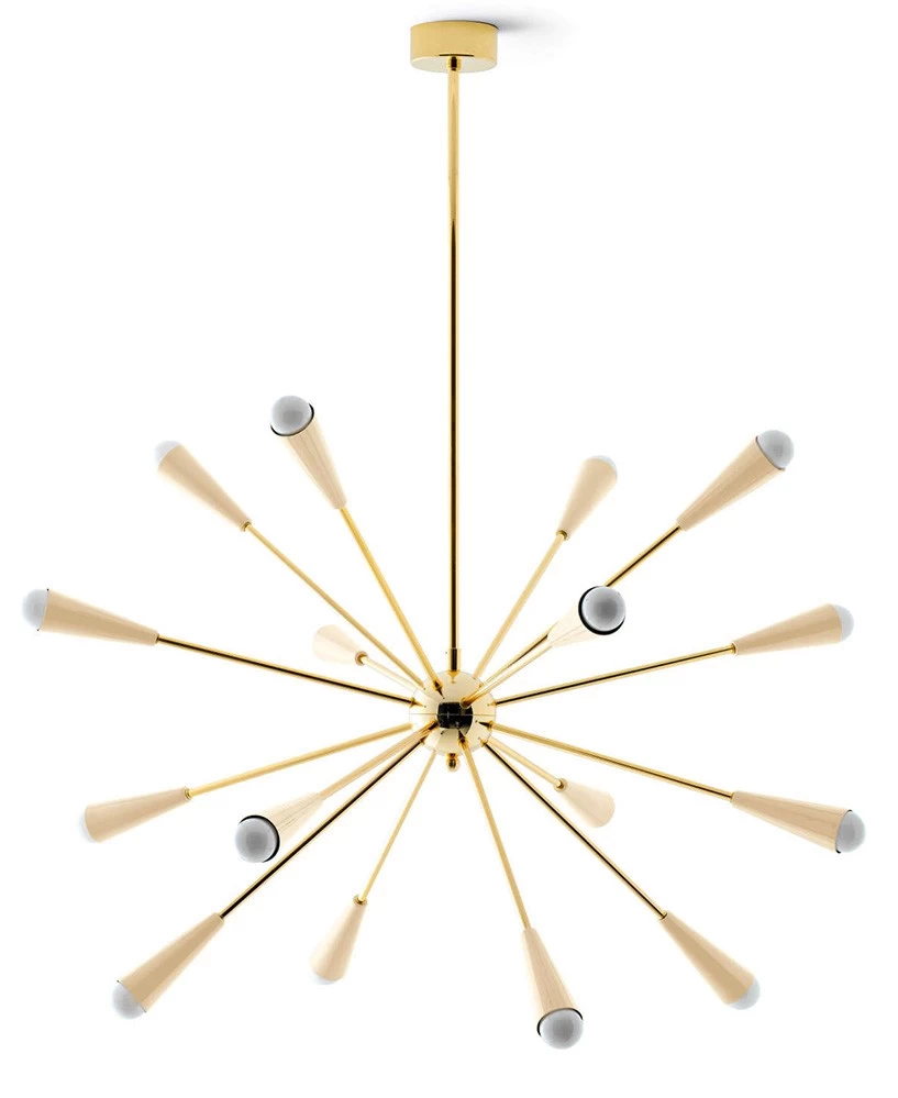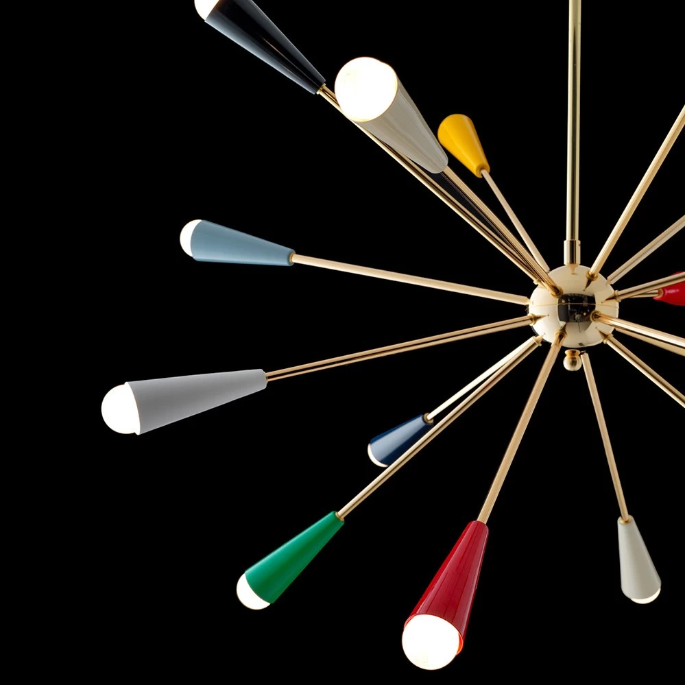 Wie ein Feuerwerk breitet sich der Sputnik Kronleuchter an der Decke aus. Die Struktur mit 16 Armen aus vergoldetem Messing verbindet sich mit den schwarzen oder elfenbeinfarbigen Reflektoren – oder der typisch italienischen farbigen Variante.