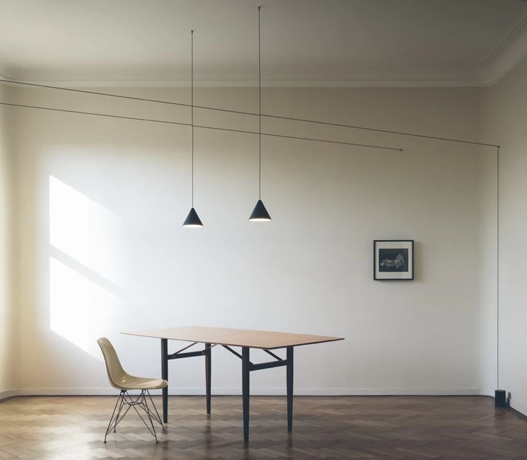 Die Lieferung erfolgt inklusive fünf weißen und schwarzen Wandbefestigungen als Montagekit, um do die Leuchte im Raum optimal zu positionieren. Diese minimalistische Lösung erlaubt, dass das Kabel gleichzeitig dekoratives Element wird.