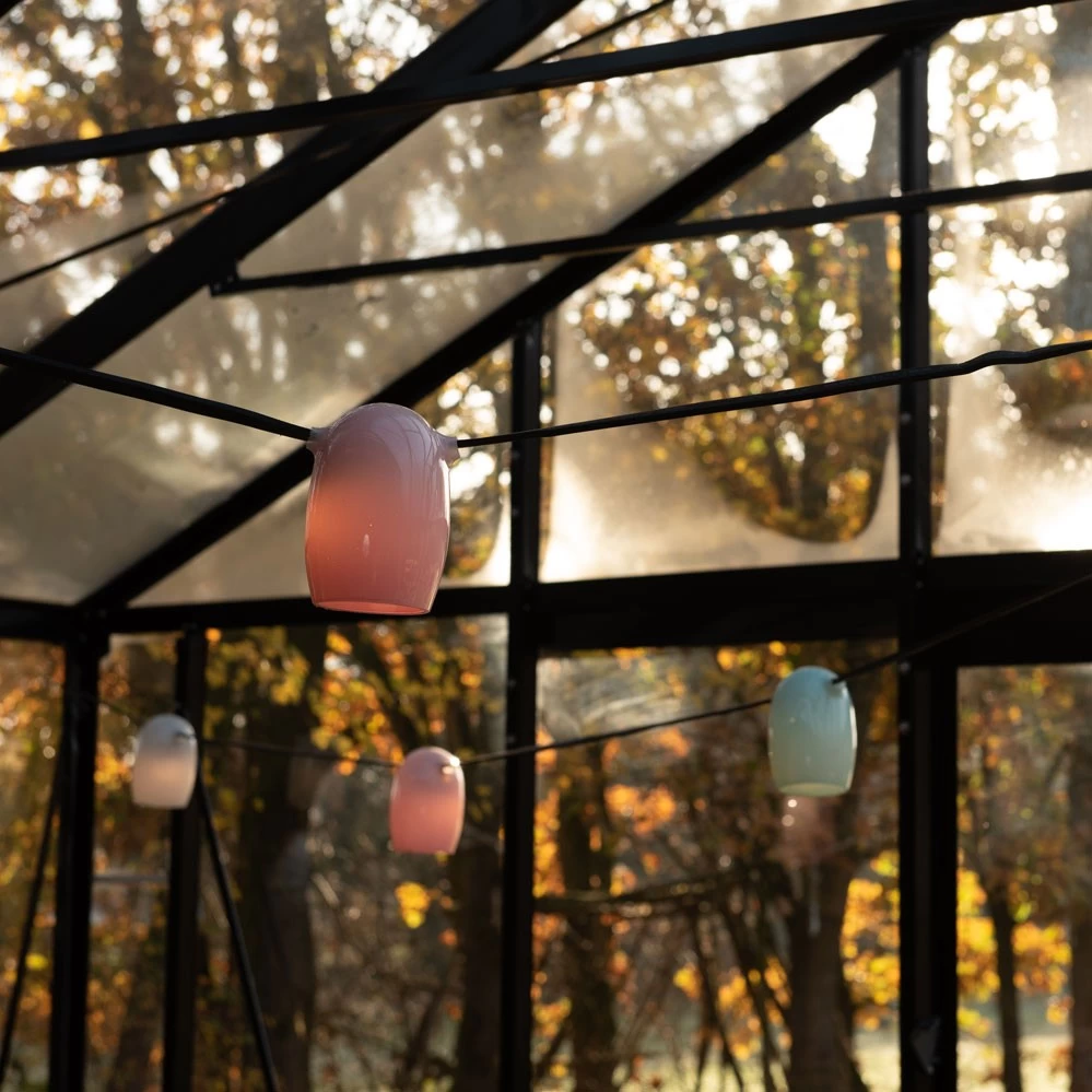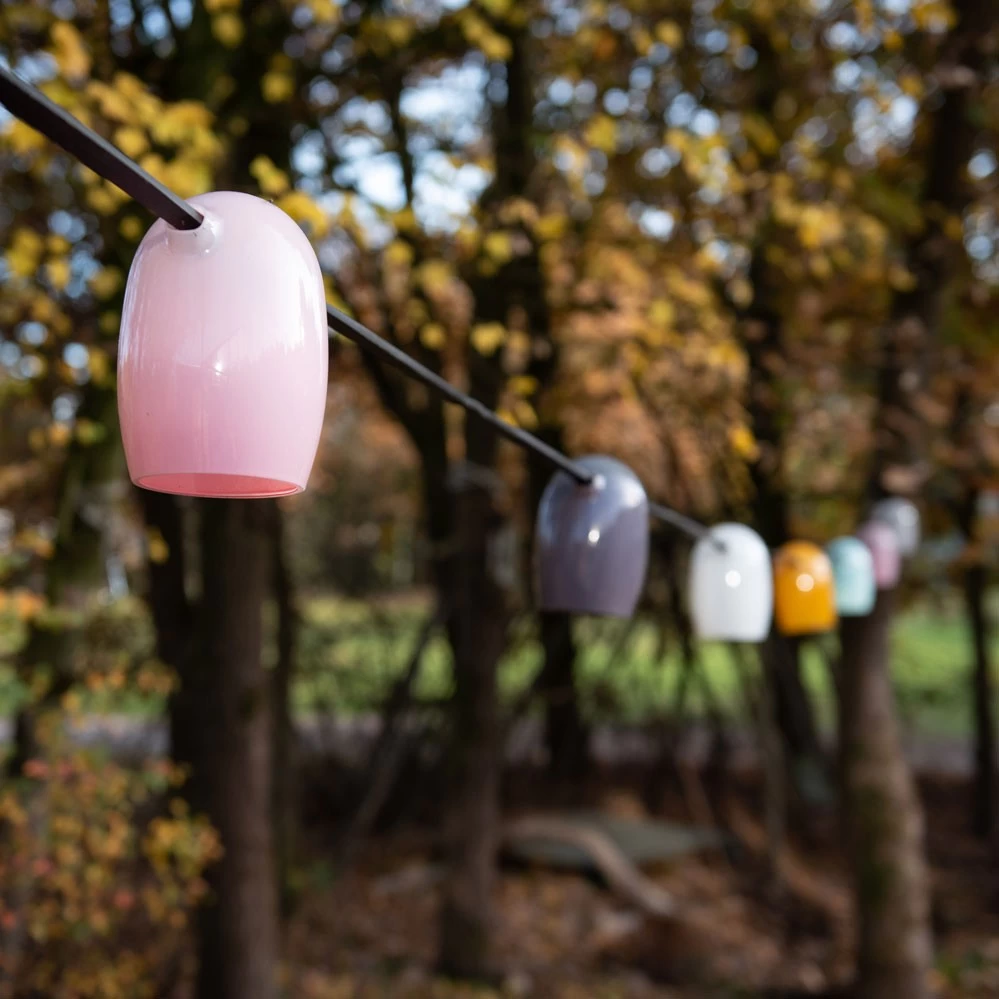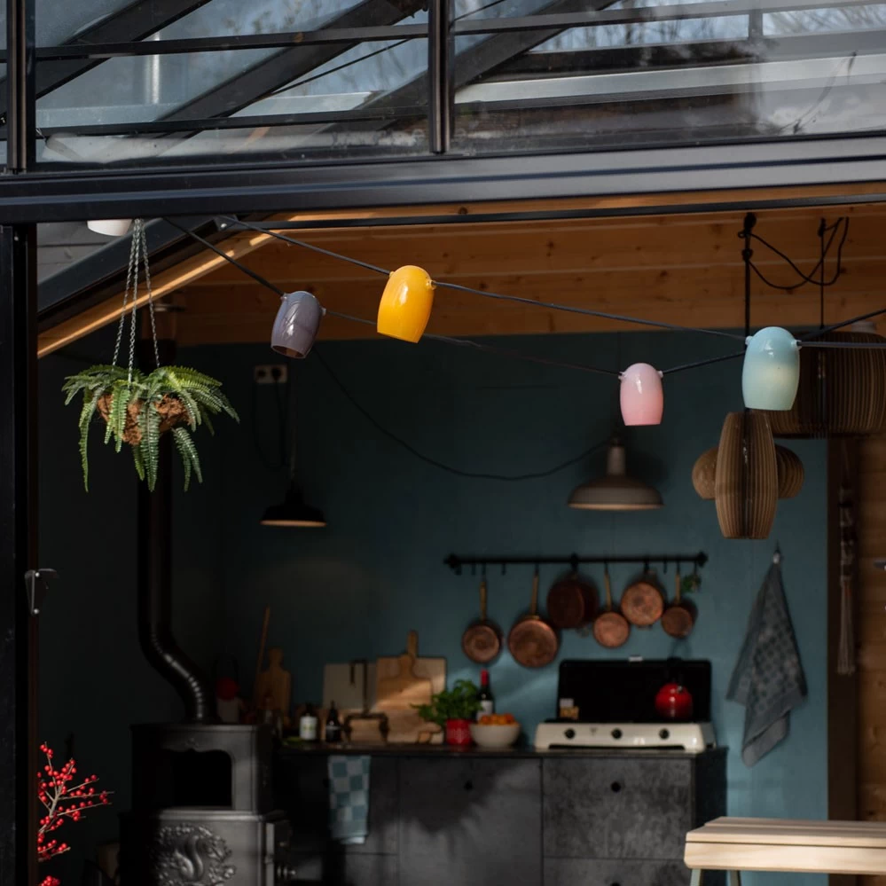 Die 12 Meter lange Lichterkette Stringlight von Floris Schoonderbeek ist sowohl für den Innen- wie Außeneinsatz gedacht. Die acht Leuchtenschirme verwandeln ein normales Lampenkabel in eine originelle und geschmackvolle Lichterkette.