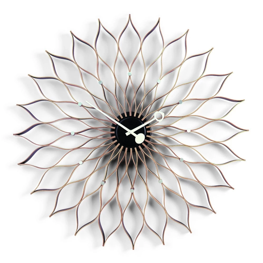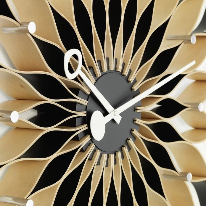 Mit einem Durchmessser von 75 cm ist die Sunflower Clock (oder auch Plywood Clock) das größte Modell der Vitra Wall Clocks. Ursprünglich wurde die Uhr zwischen 1958 und 1959 vom George Nelson Office entworfen, der eigentliche Entwurf wird heute dem George Nelson Mitarbeiter Irving Harper zugeschrieben. Die handwerliche Herstellung der skulpturen Wanduhr aus Birkenschichtholz ist durch die Formgebung recht aufwendig.
